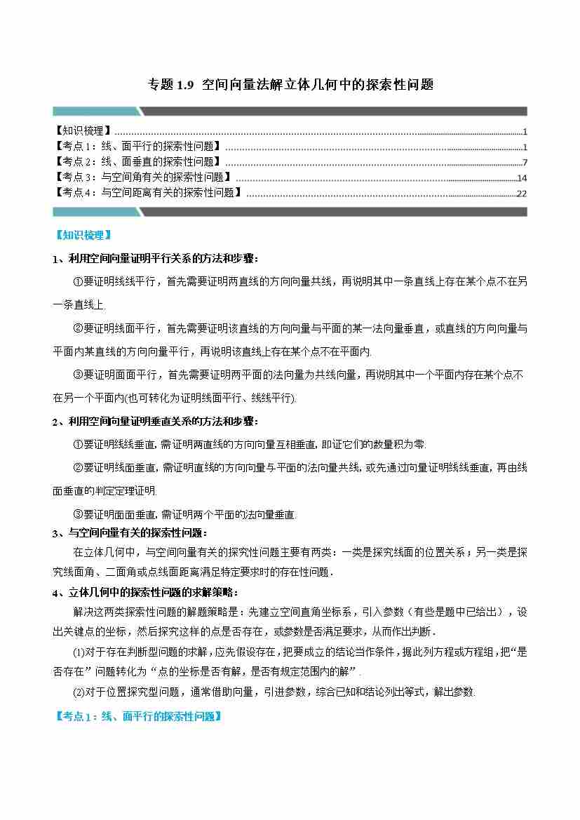 专题1.9 空间向量法解立体几何中的探索性问题(4类必考点)(学生版)