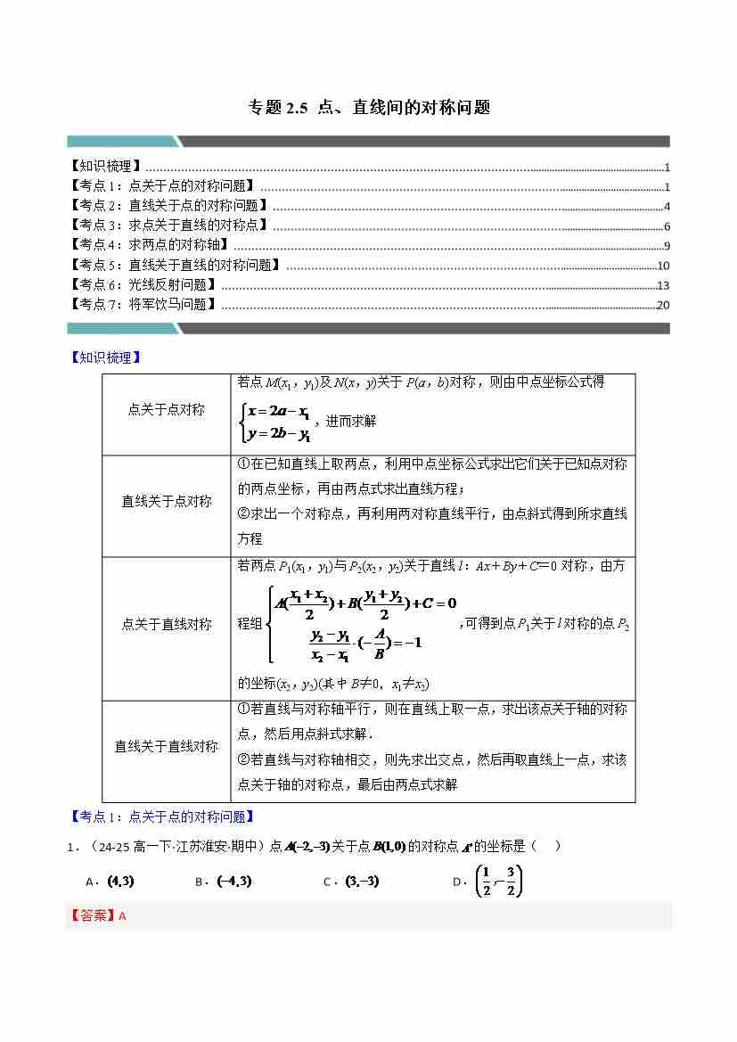 专题2.5 点、直线间的对称问题(7类必考点)(教师版)