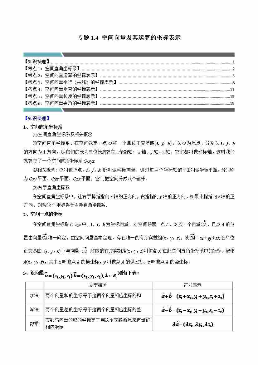 专题1.4 空间向量及其运算的坐标表示(6类必考点)(学生版)