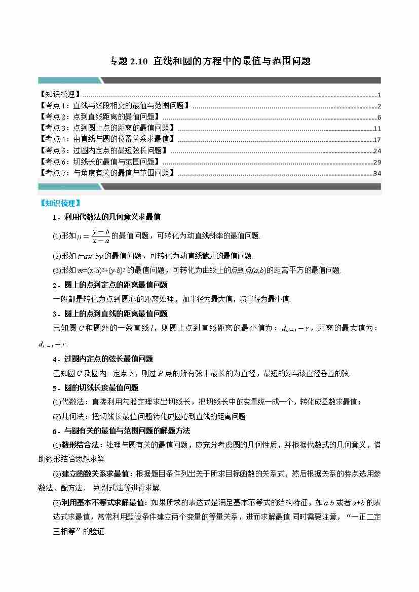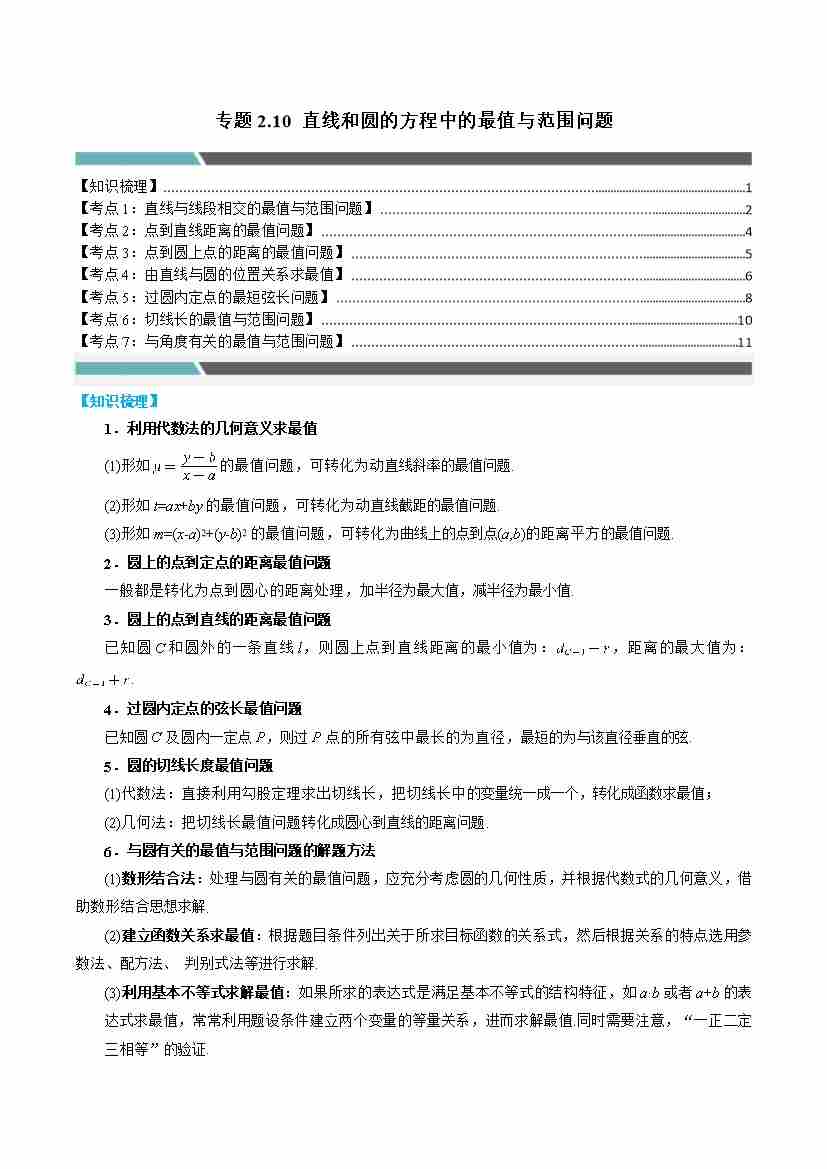 专题2.10 直线和圆的方程中的最值与范围问题(7类必考点)(教师版)