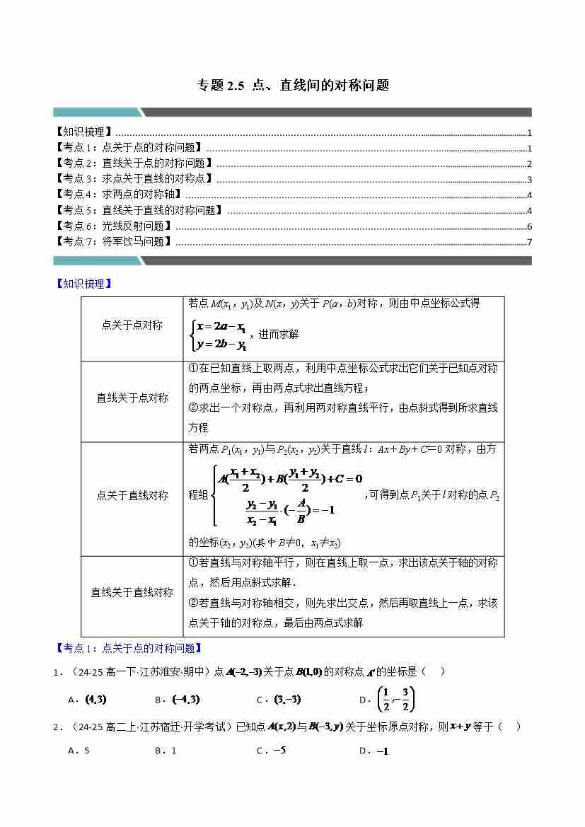 专题2.5 点、直线间的对称问题(7类必考点)(学生版)
