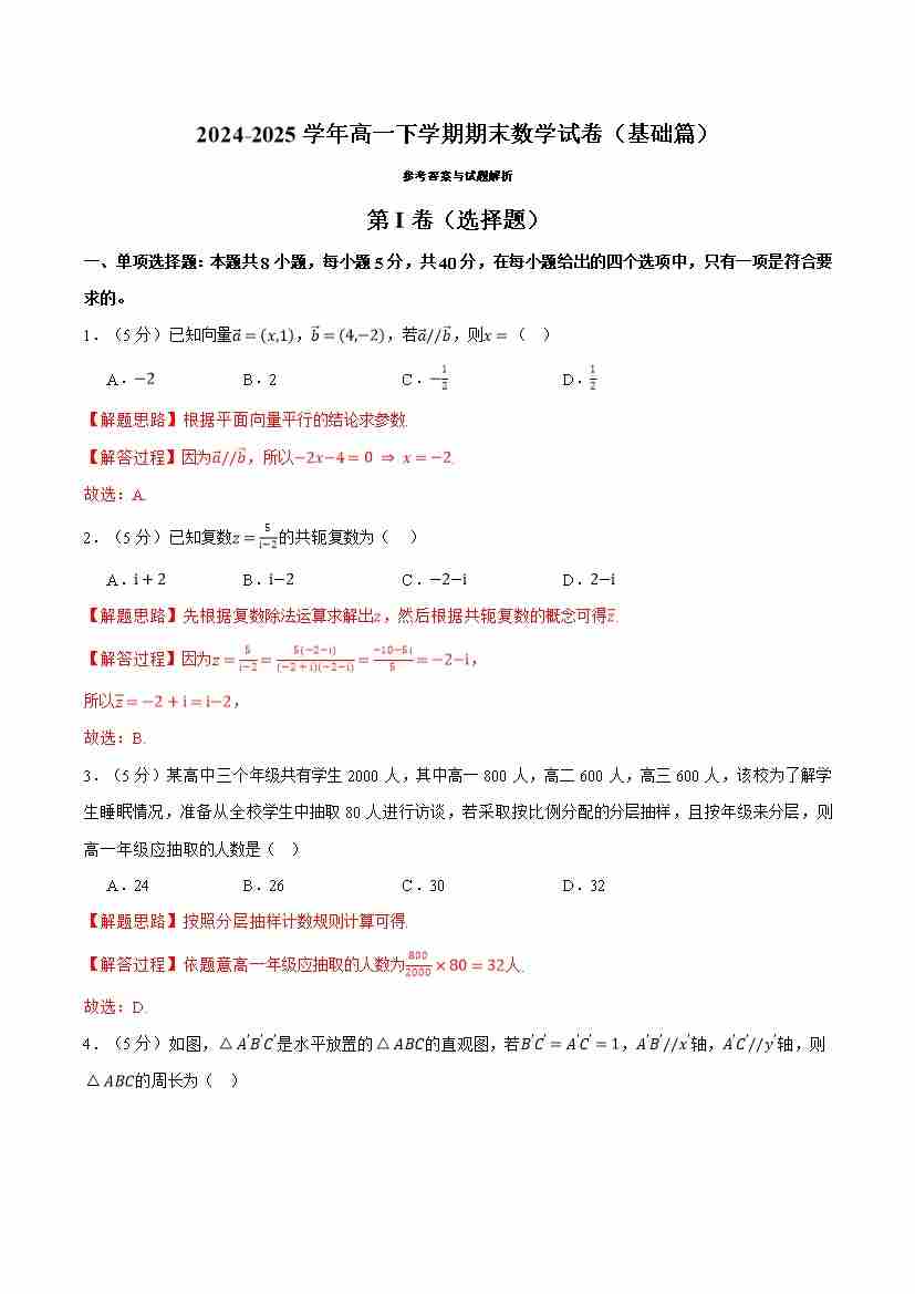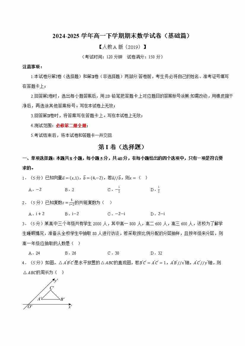 高一下学期期末数学试卷(基础篇)(学生版)