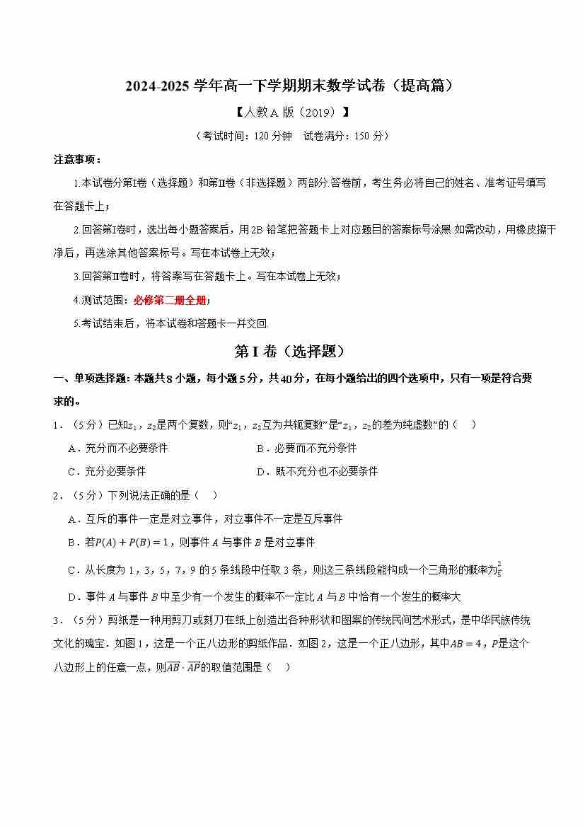 高一下学期期末数学试卷(提高篇)(人教A版2019必修第二册)(学生版)