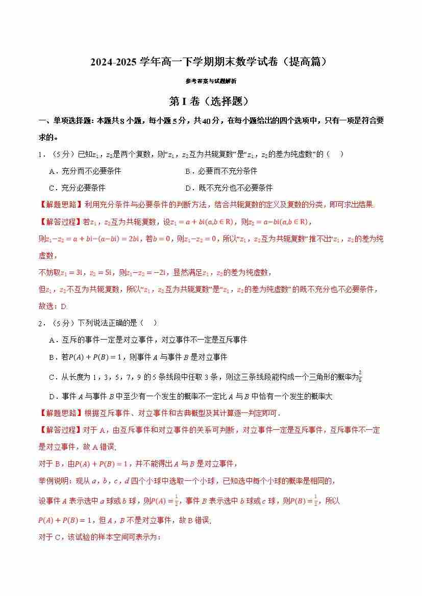 高一下学期期末数学试卷(提高篇)(人教A版2019必修第二册)(教师版)