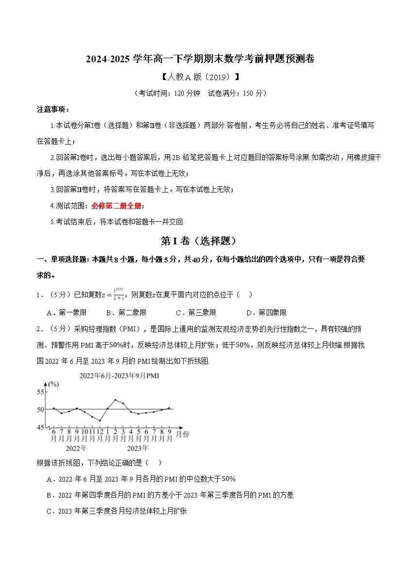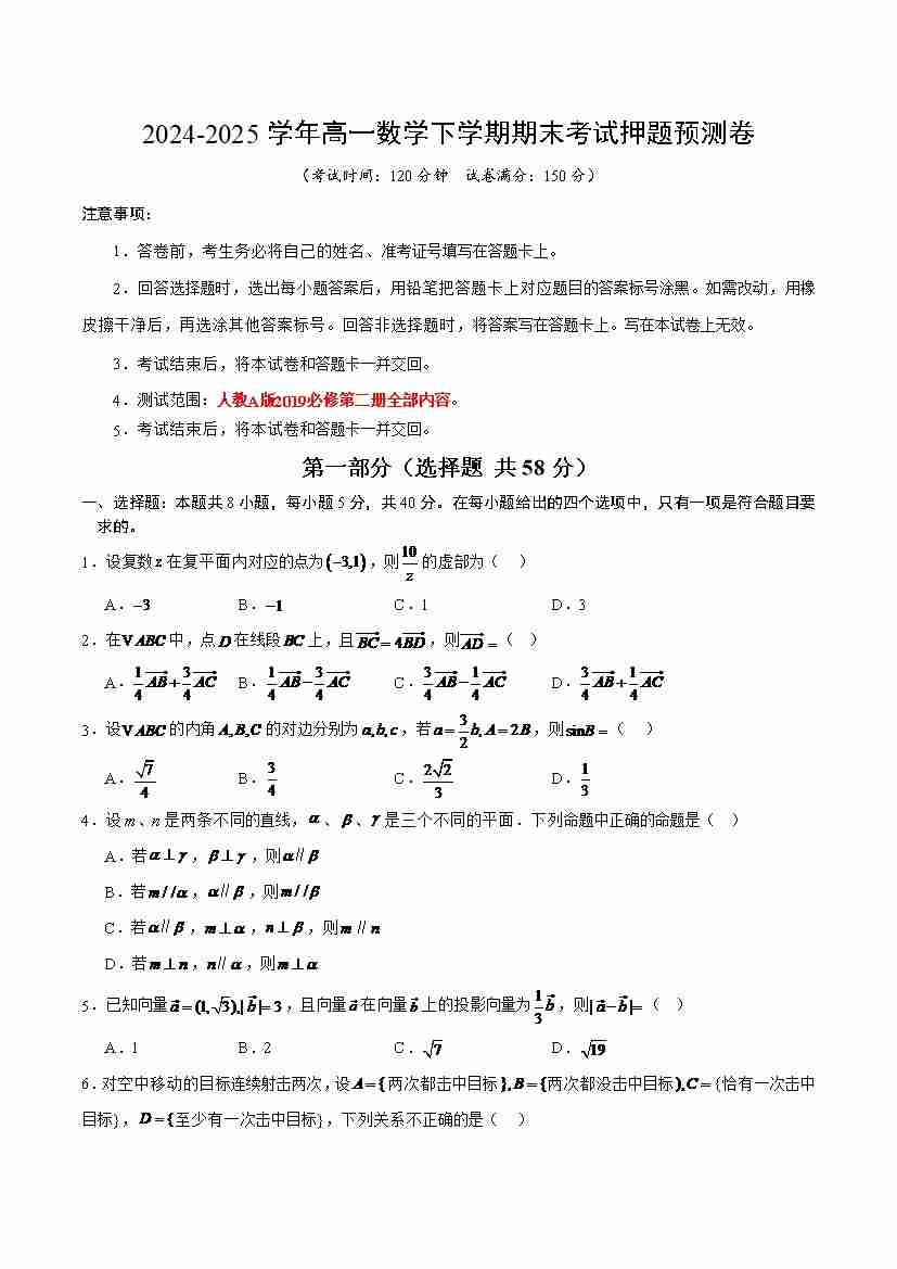 高一数学下学期期末考试押题预测卷(试题)(测试范围:必修第二册全部内容)(人教A版2019)