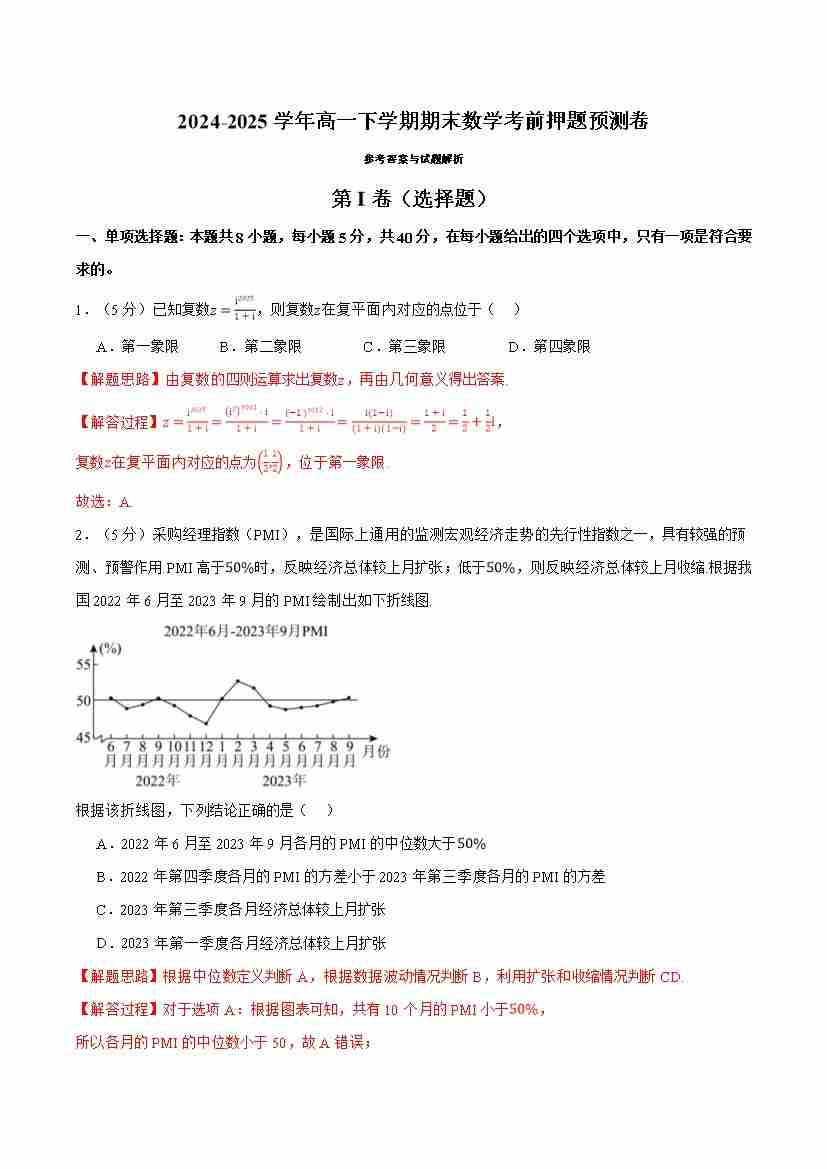 高一下学期期末数学考前押题预测卷(教师版)