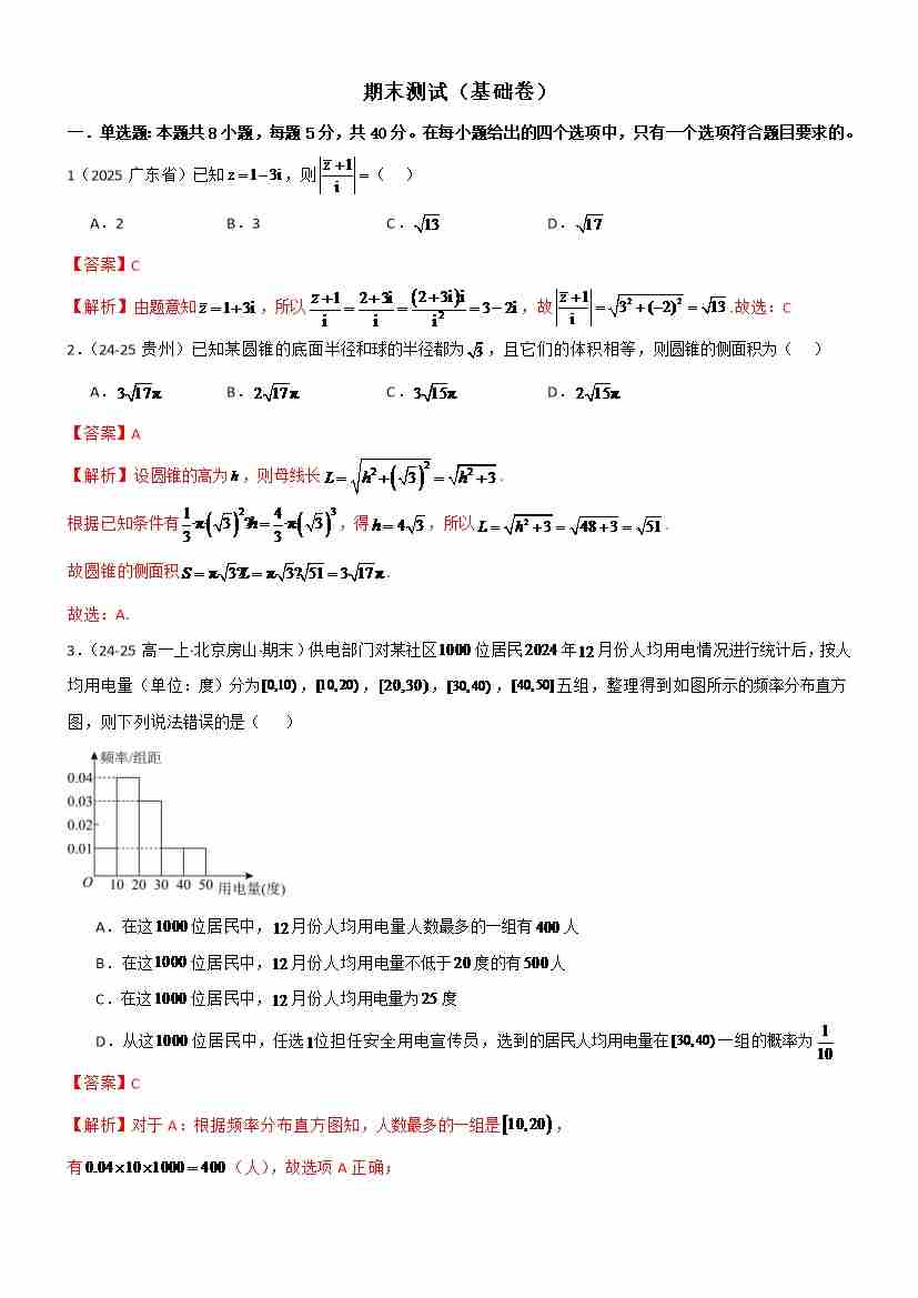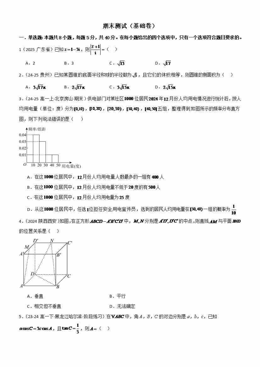 高一下学期期末测试(基础卷)(学生版)