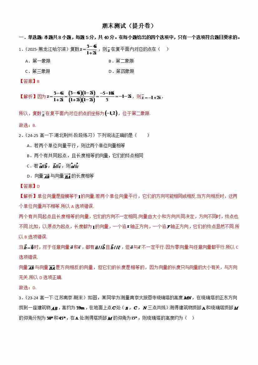 高一下学期期末测试(提升卷)(教师版)