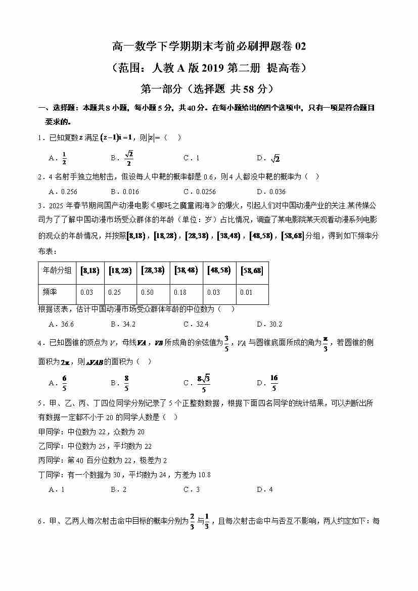 高一数学下学期期末考前必刷押题卷02(范围:人教A版2019必修第二册 提高卷)(学生版)