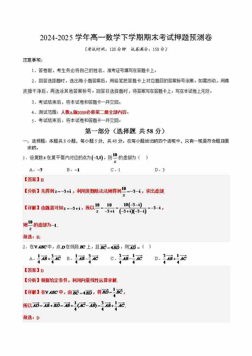 高一数学下学期期末考试押题预测卷(全解全析)(人教A版2019)