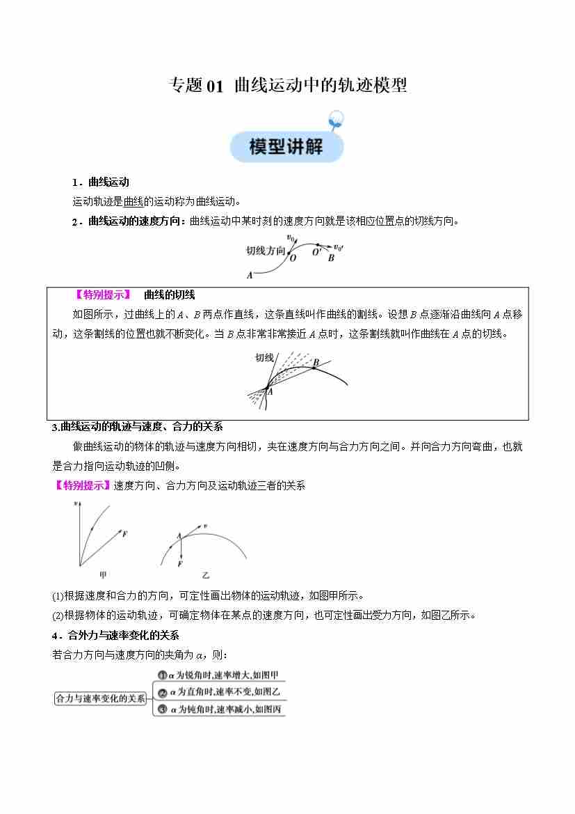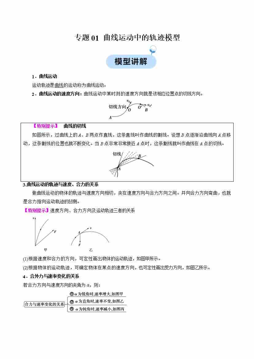 专题01 曲线运动中的轨迹模型(学生版)