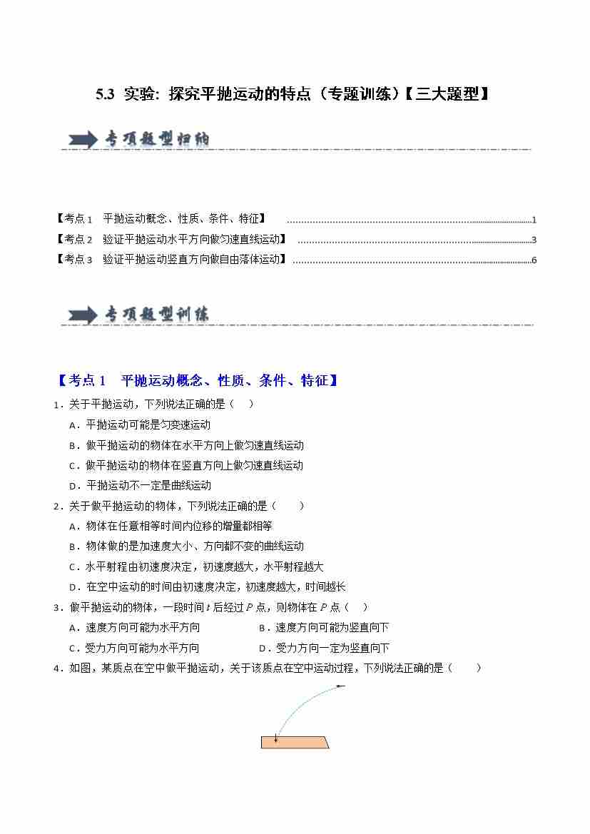 5.3 实验 探究平抛运动的特点(专题训练)(三大题型)(学生版)