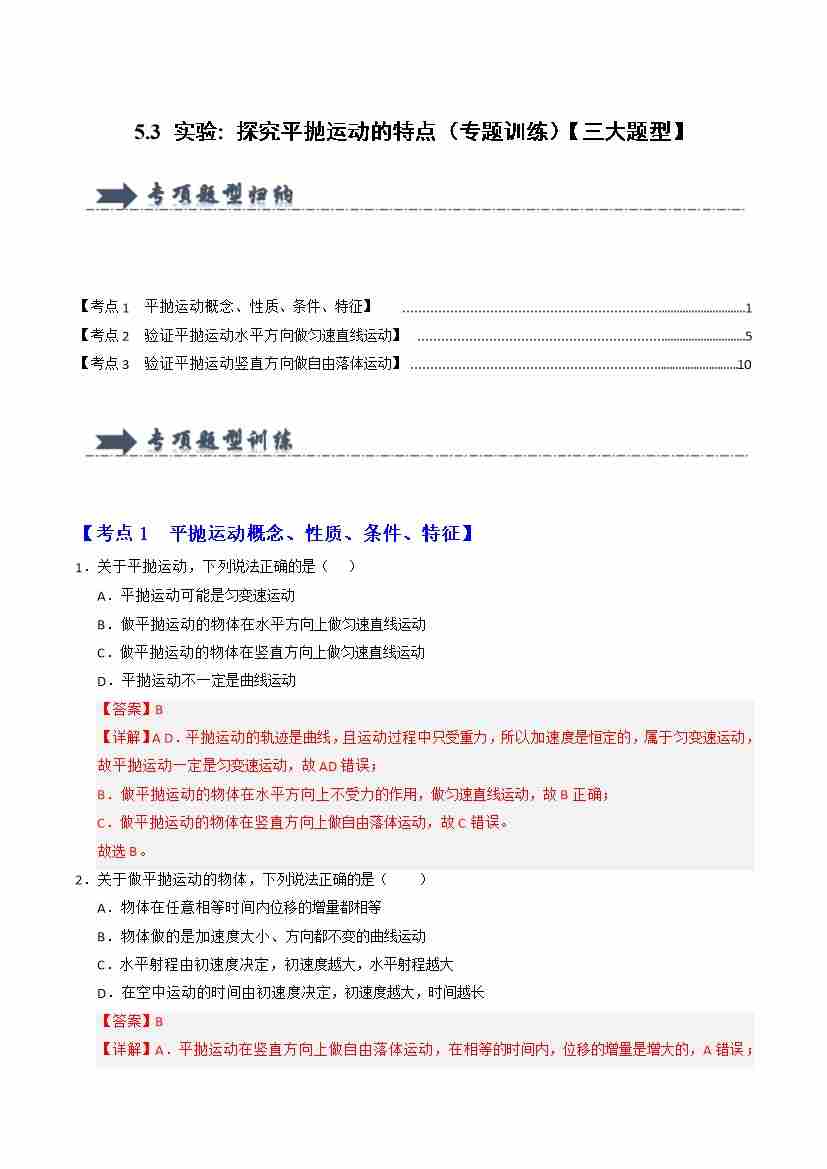 5.3 实验 探究平抛运动的特点(专题训练)(三大题型)(教师版)