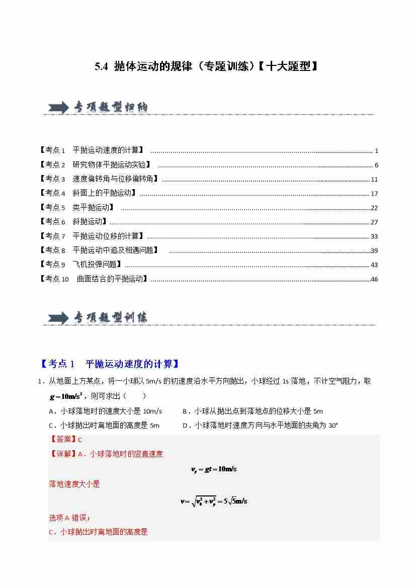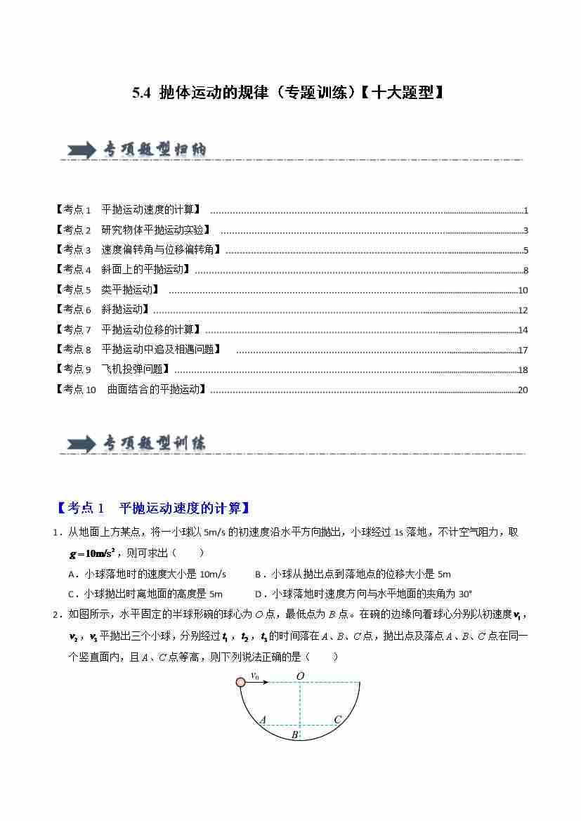 5.4 抛体运动的规律(专题训练)(十大题型)(学生版)