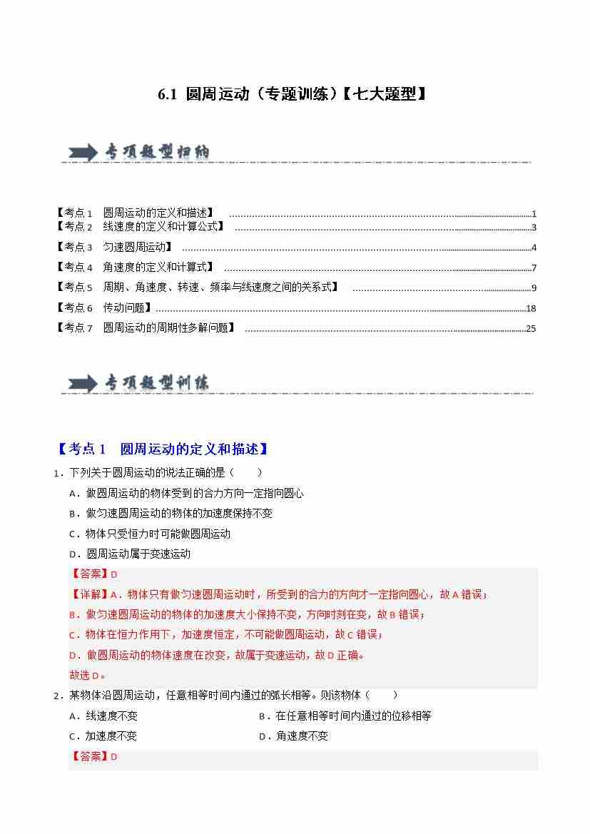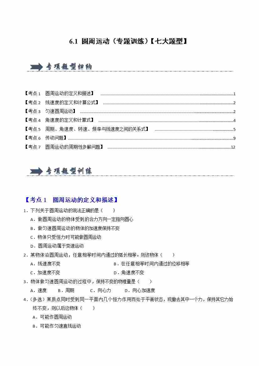 6.1 圆周运动(专题训练)(七大题型)(教师版)