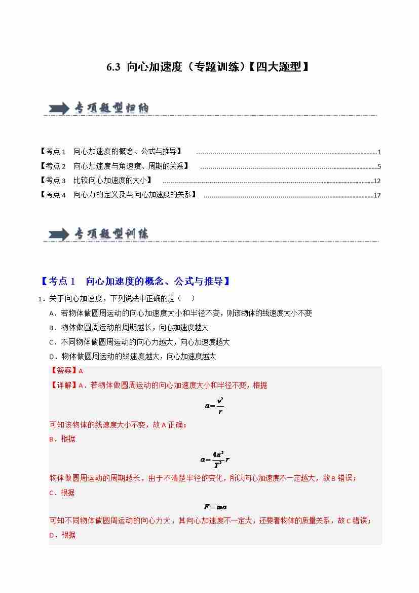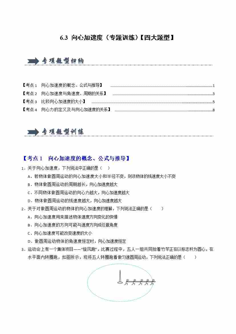 6.3 向心加速度(专题训练)(四大题型)(学生版)