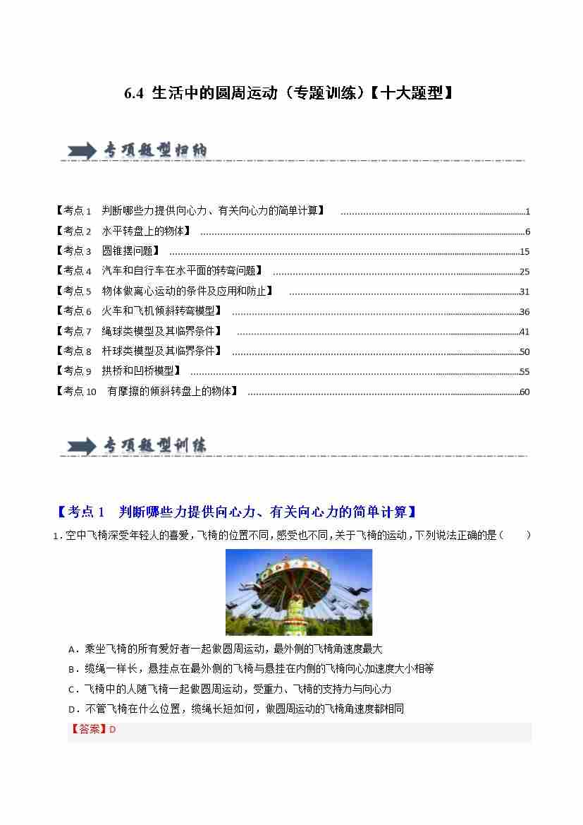 6.4 生活中的圆周运动(专题训练)(十大题型)(学生版)