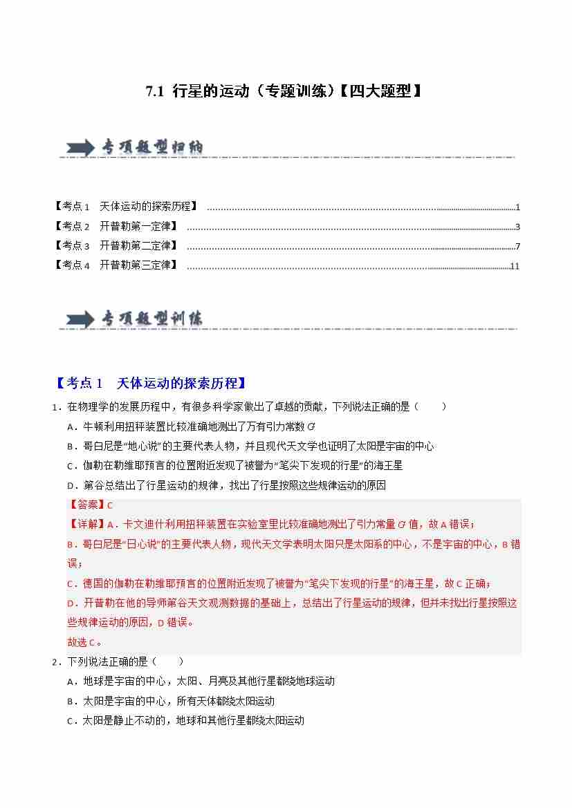 7.1 行星的运动(专题训练)(四大题型)(教师版)