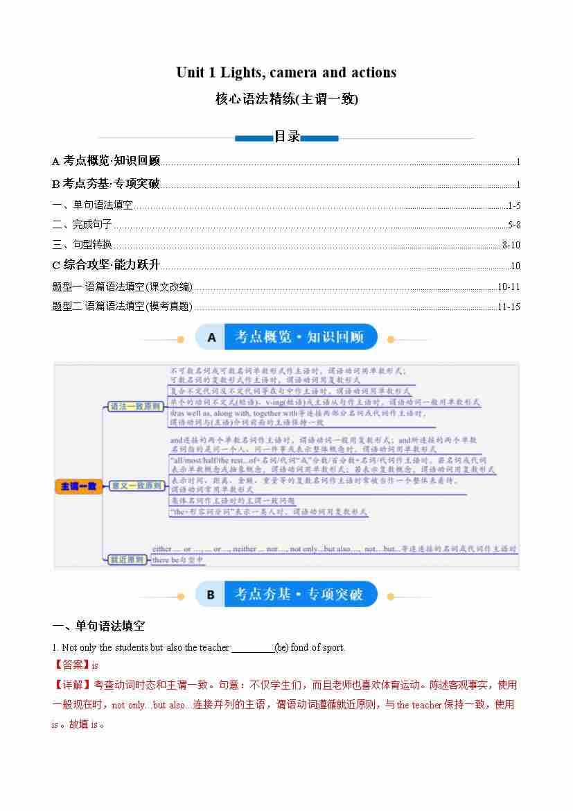 Unit 1 Lights, camera and action! 主谓一致(单元核心语法精练)(教师版)