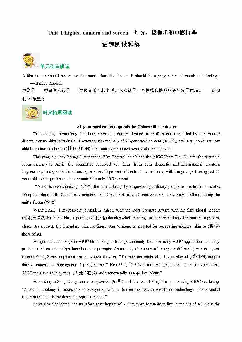 Unit 1 Lights, camera and screen灯光,摄像机和电影银屏(话题阅读精练)(教师版)