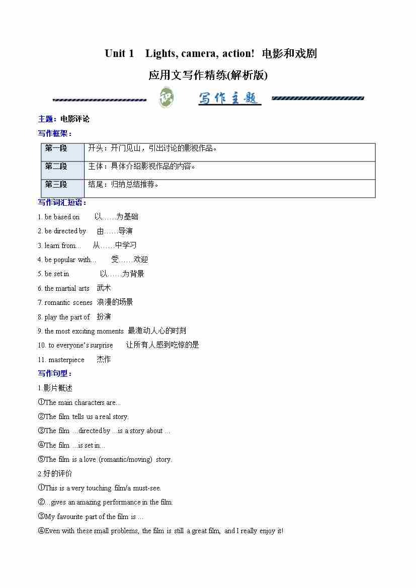 Unit 1 Lights, camera, action!! 电影和戏剧 (单元应用文写作精练)(教师版)