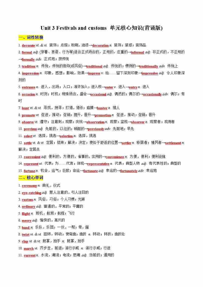 Unit 3 Festivals and customs(单元核心知识)(背诵版)
