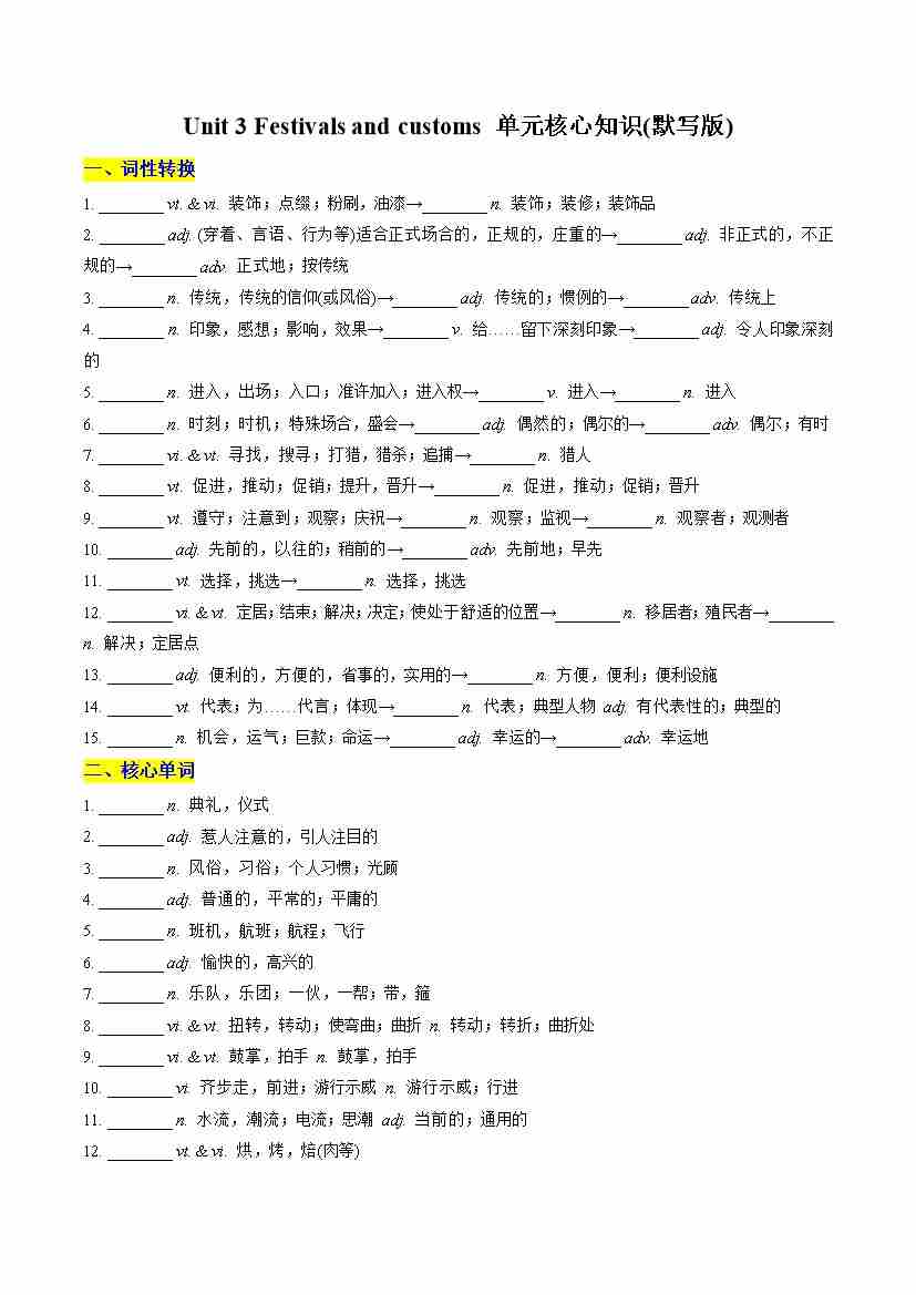 Unit 3 Festivals and customs(单元核心知识)(默写版)