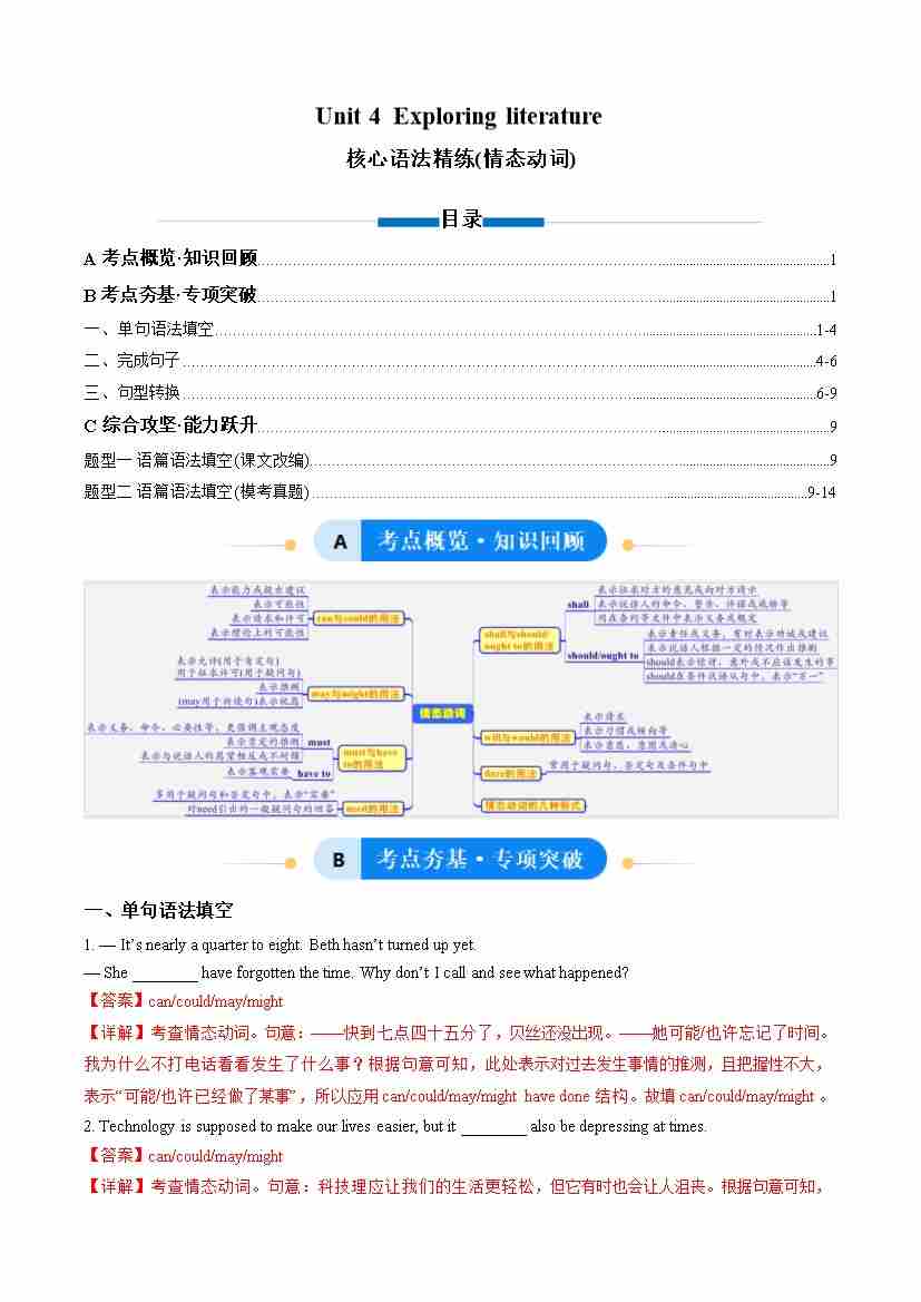 Unit 4 Exploring literature 情态动词(单元核心语法精练)(教师版)