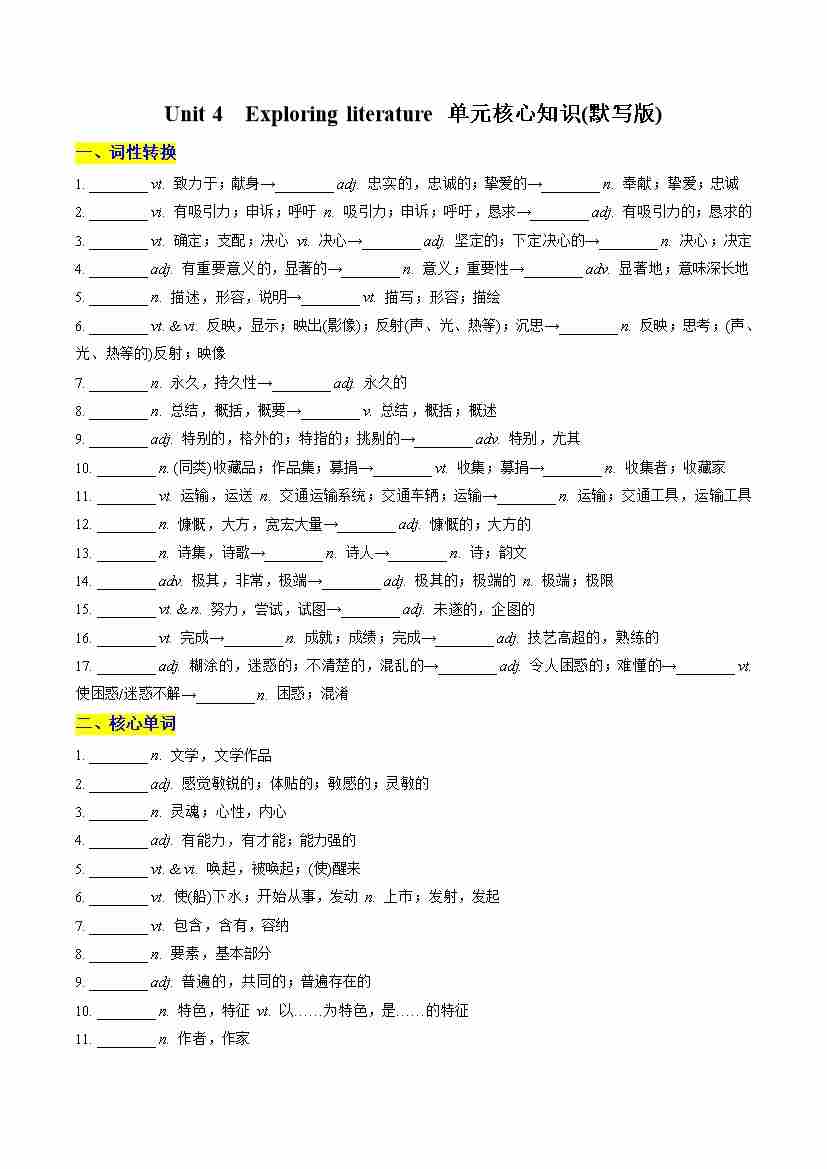 Unit 4 Exploring lliterature(单元核心知识)(默写版)