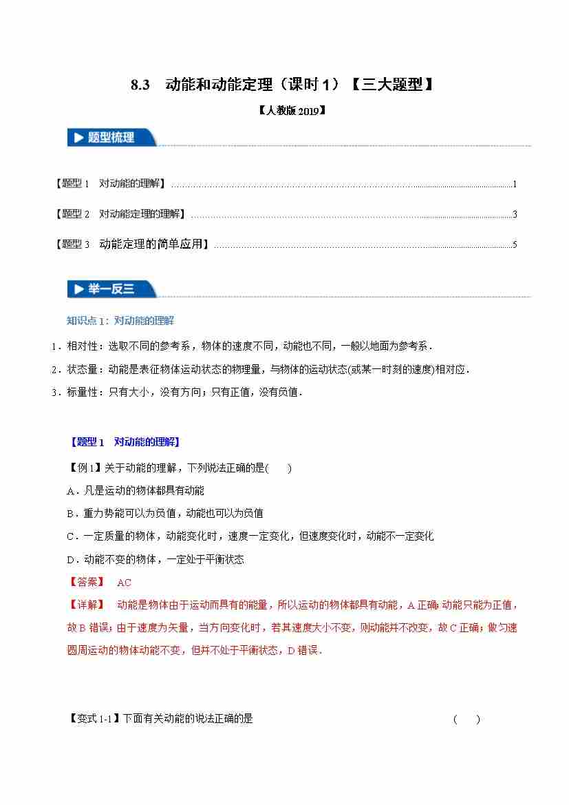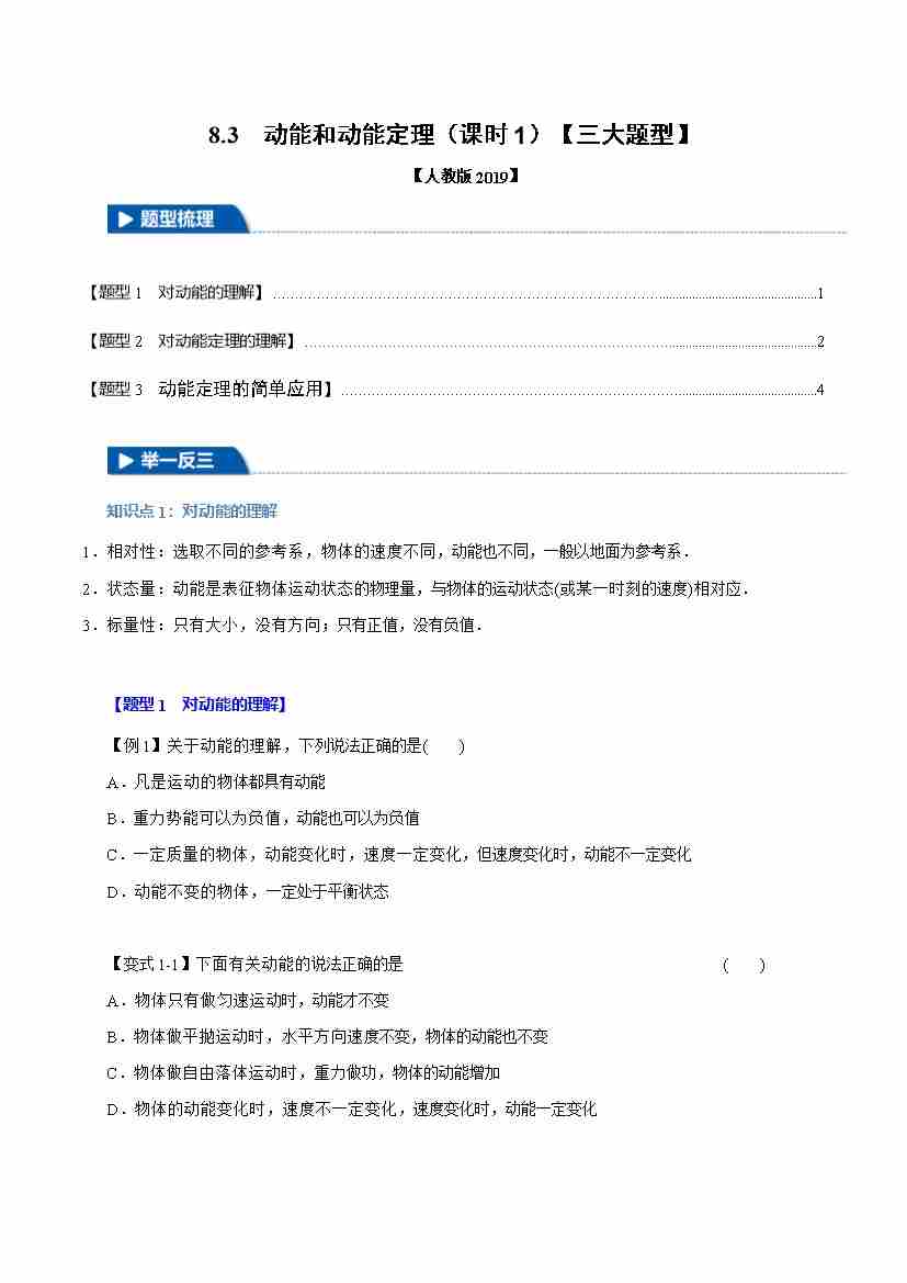 8.3 动能和动能定理(举一反三)(课时1)(三大题型)(教师版)
