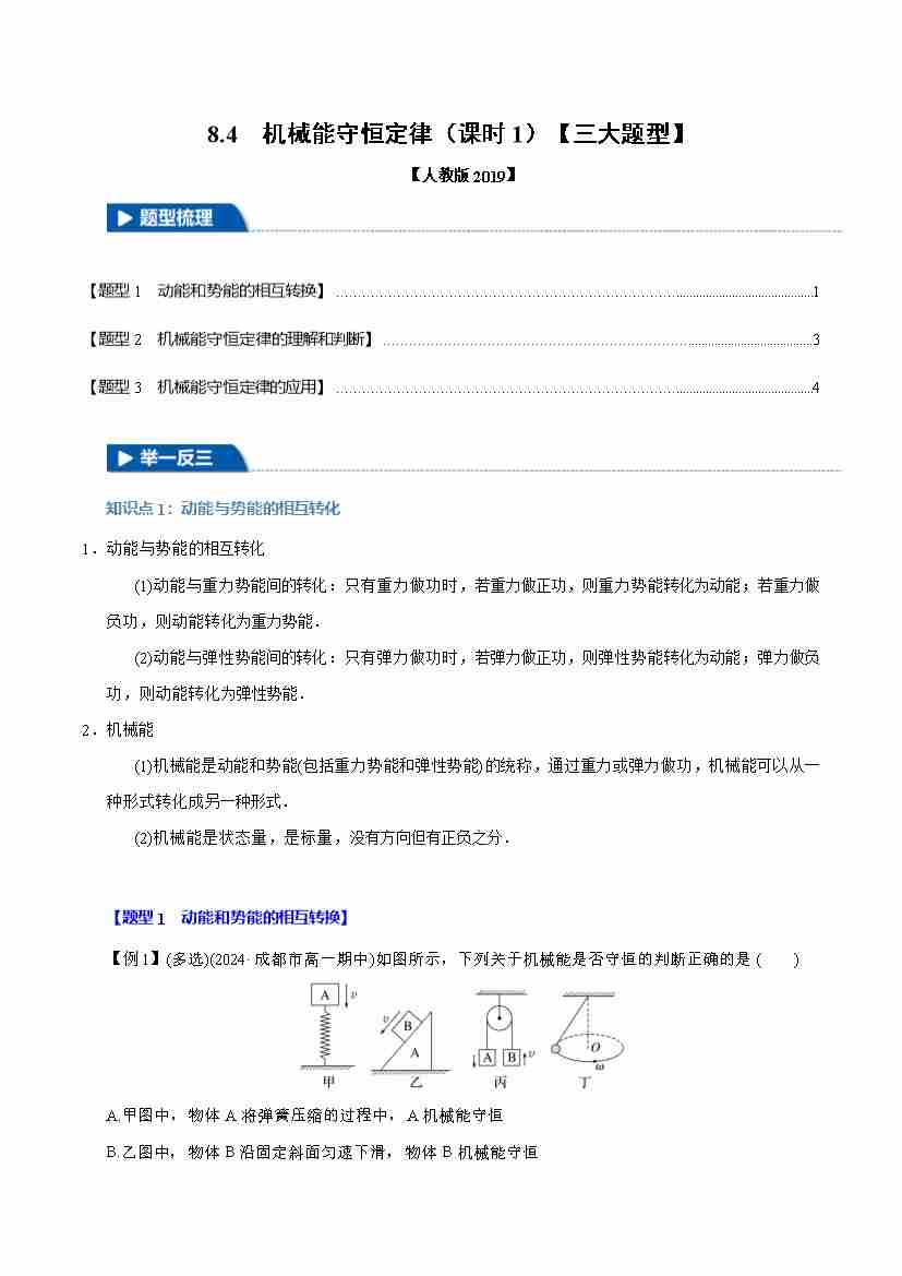 8.4 机械能守恒定律(课时1)(举一反三)(三大题型)(学生版)