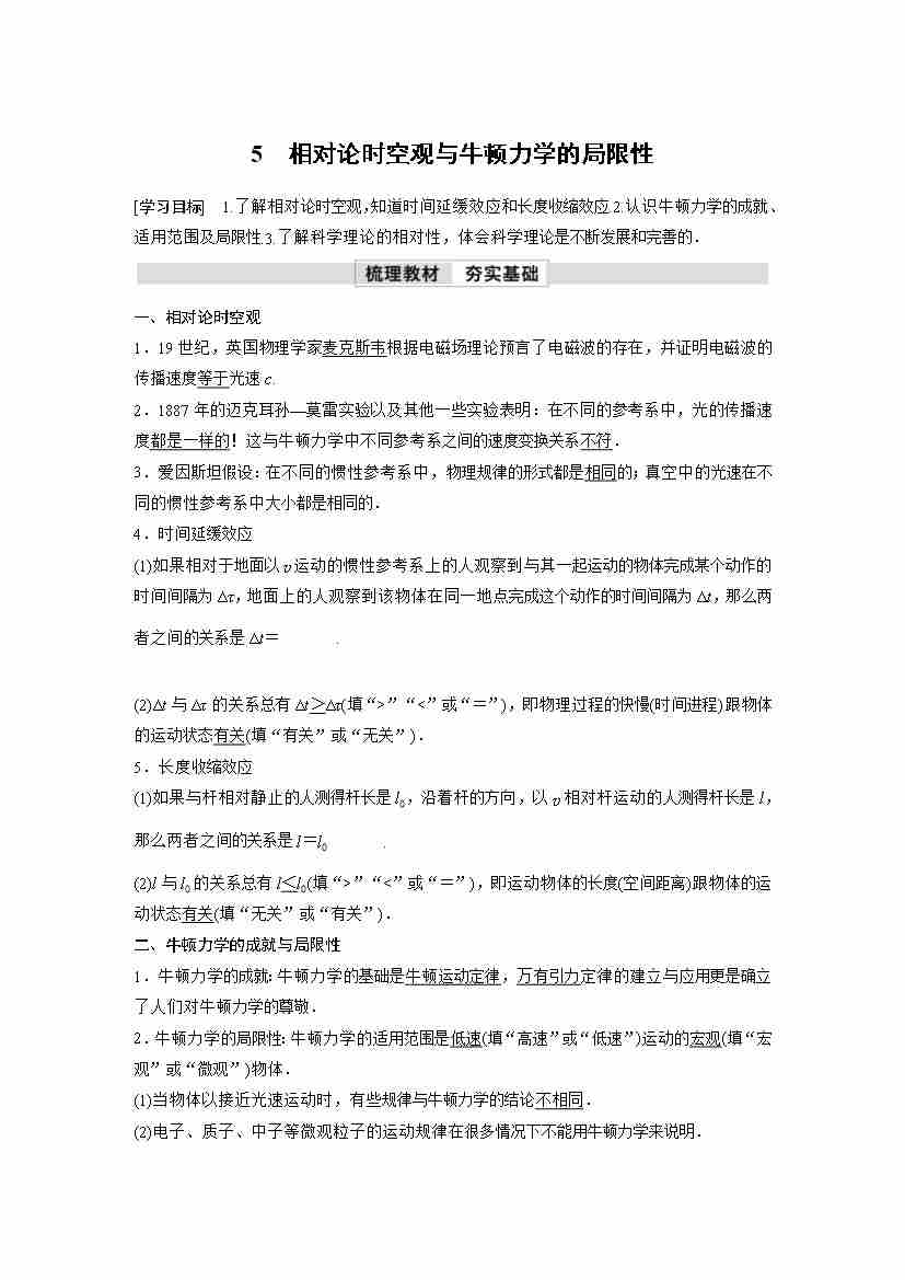 高中物理新教材同步必修第二册 第7章 5 相对论时空观与牛顿力学的局限性