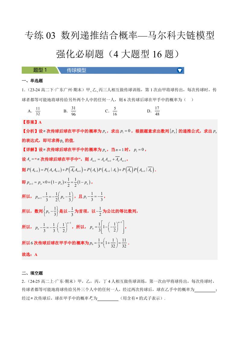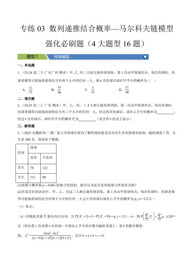专练03 (最新好题速递)马尔科夫链专项必刷(4大题型16题)学生版