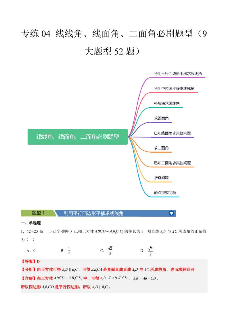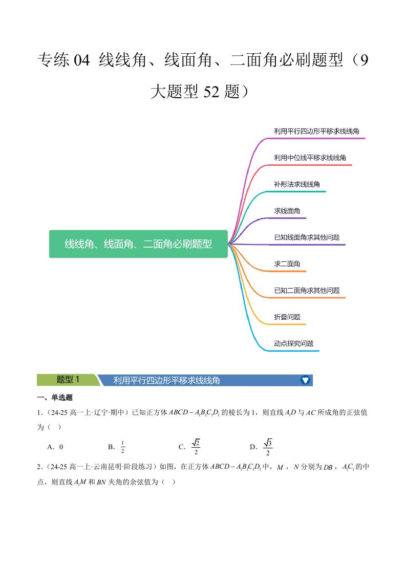专练04 (最新好题速递)线线角、线面角、二面角必刷题型(9大题型52题)学生版