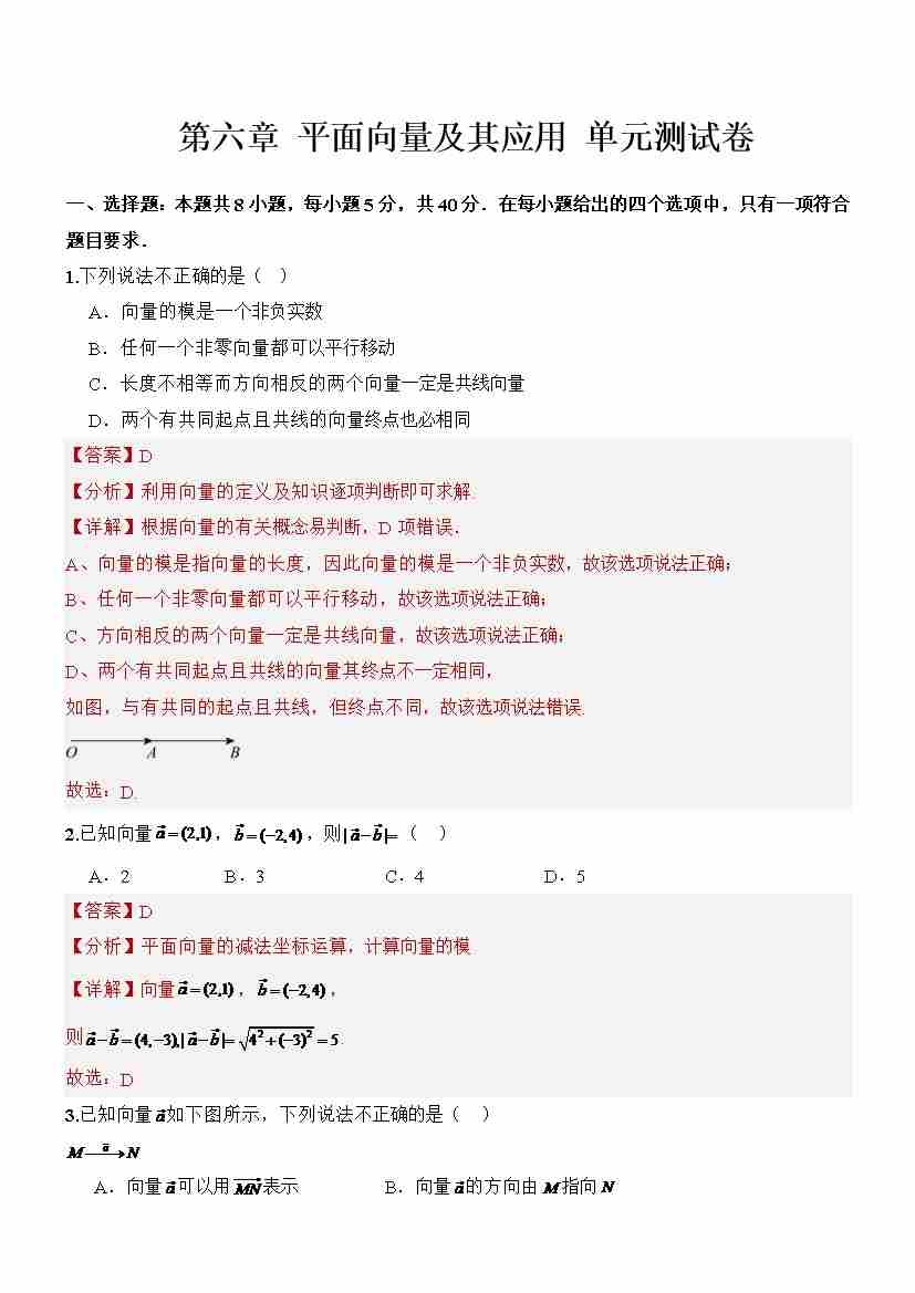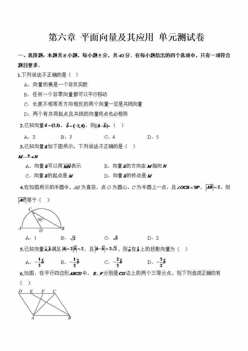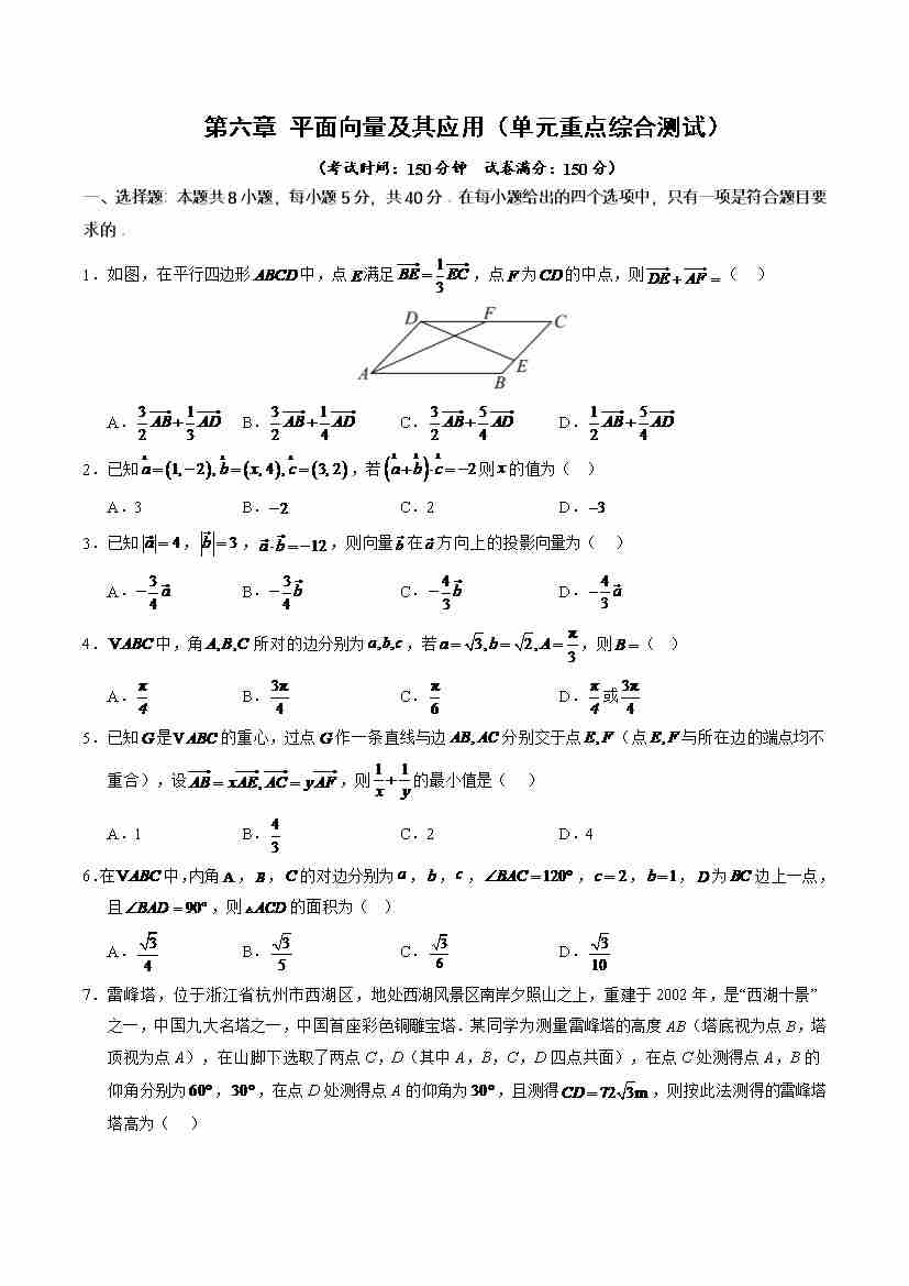 第六章平面向量及其应用 (单元测试)(原卷版)-(人教A版2019必修第二册)