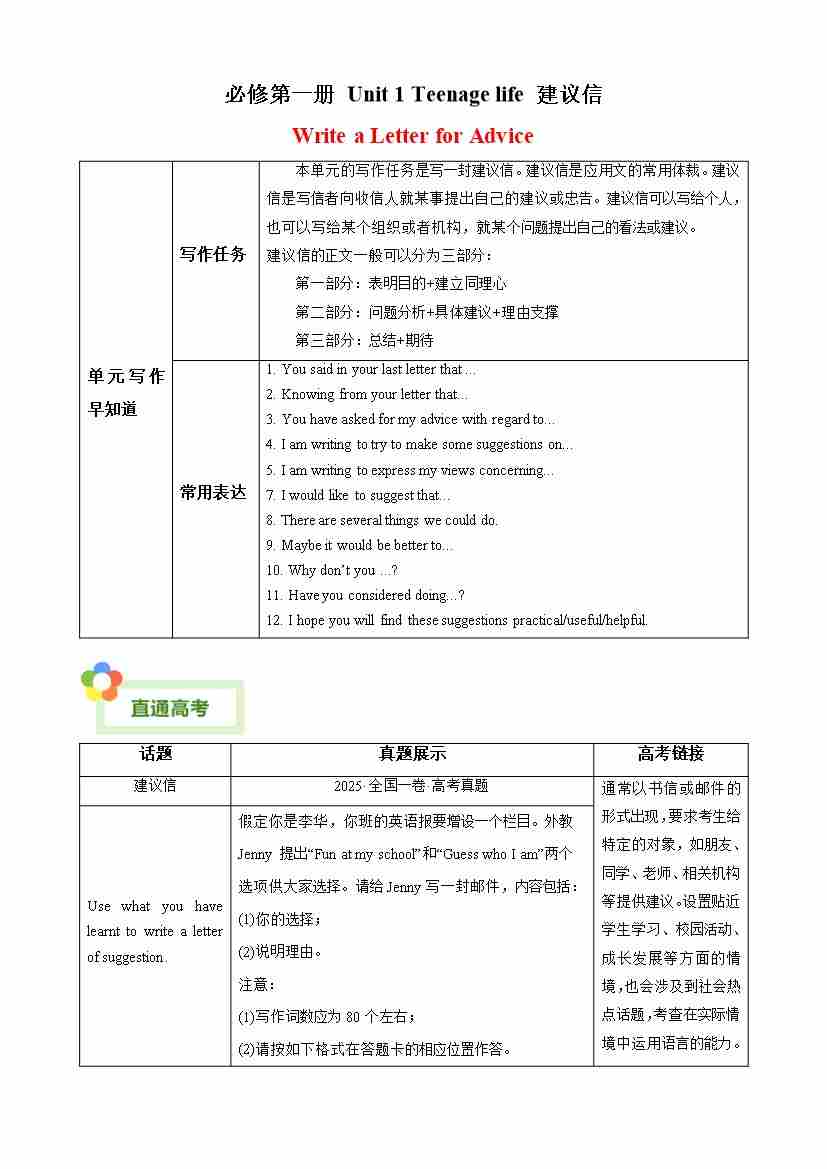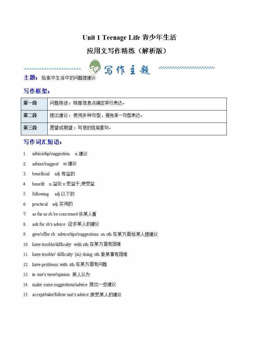 Unit 1 Teenage Life 建议信(单元同步写作讲义)(学生版)