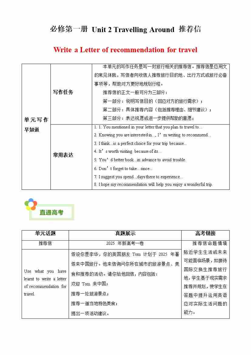 Unit 2 Travelling Around 推荐信(单元同步写作讲义)英语人教版2019必修第一册(教师版)