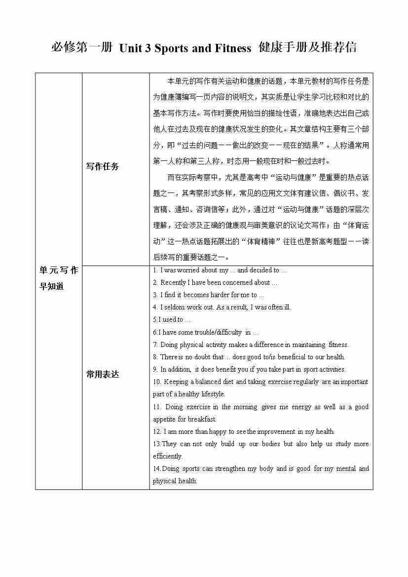 Unit 3 Sports and Fitness 健康手册及推荐信(单元同步写作讲义)(教师版)