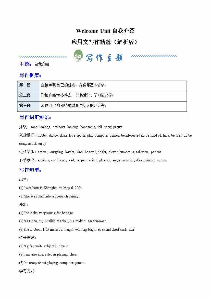 Welcome Unit 自我介绍(单元同步写作讲义)(学生版)