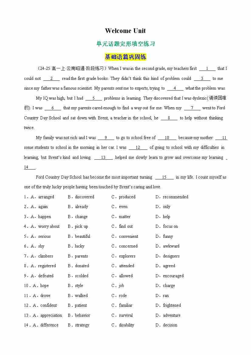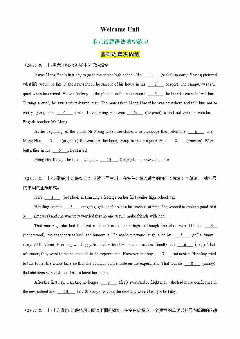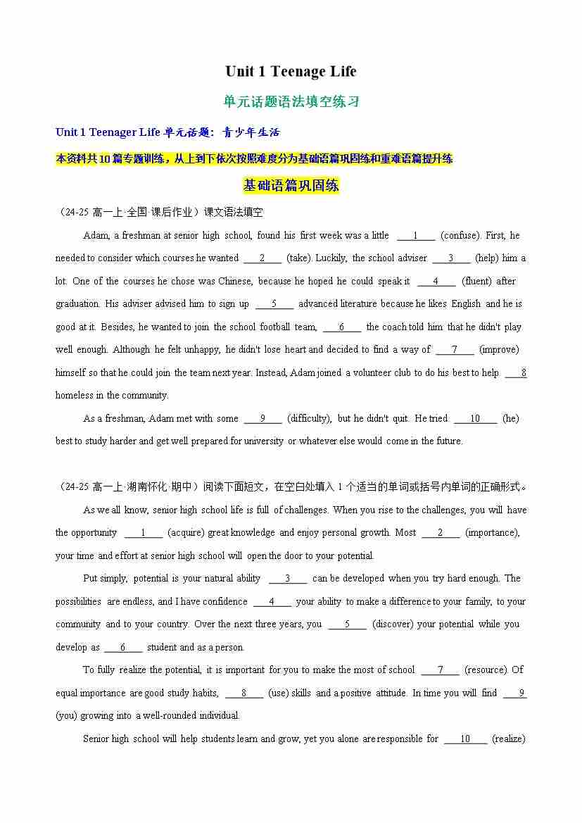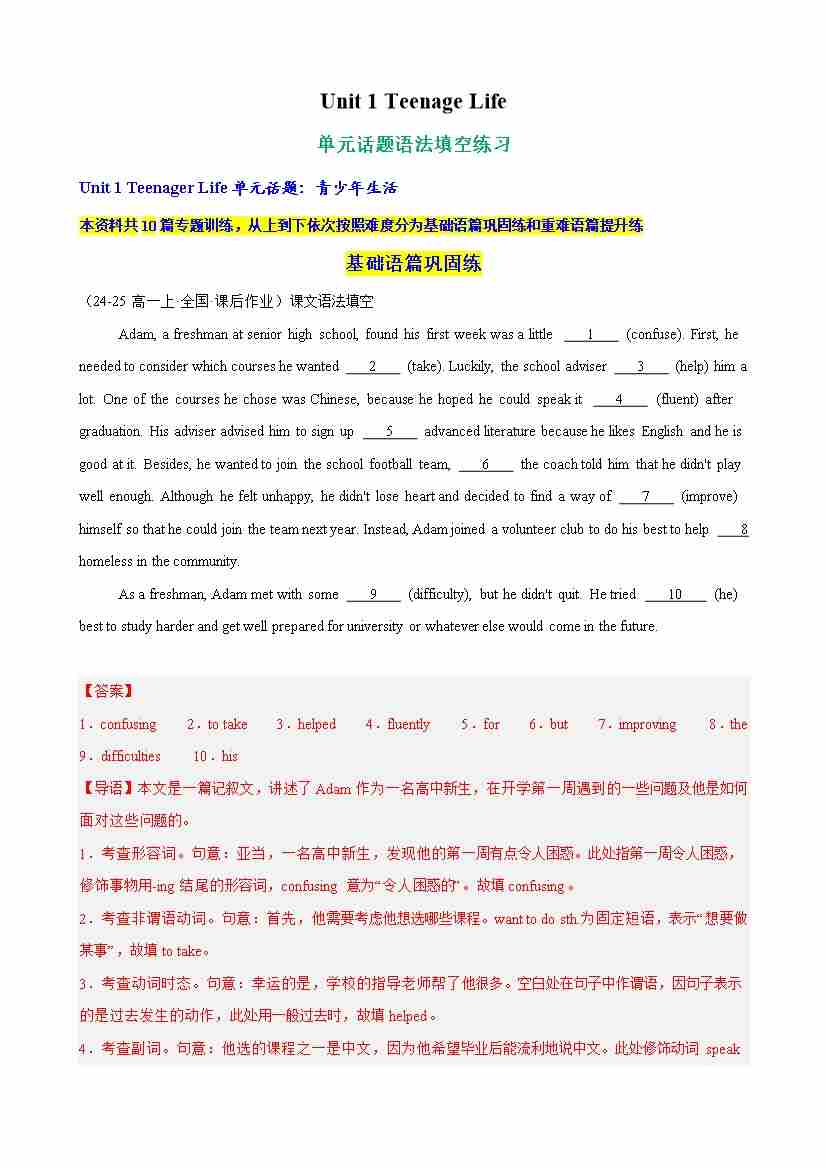 Unit 1 Teenage Life 单元话题语法填空练习(学生版)