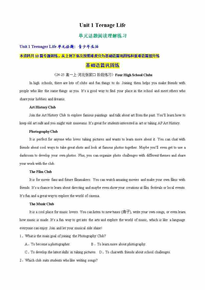 Unit1Teenage Life青少年生活话题阅读精练 (学生版)