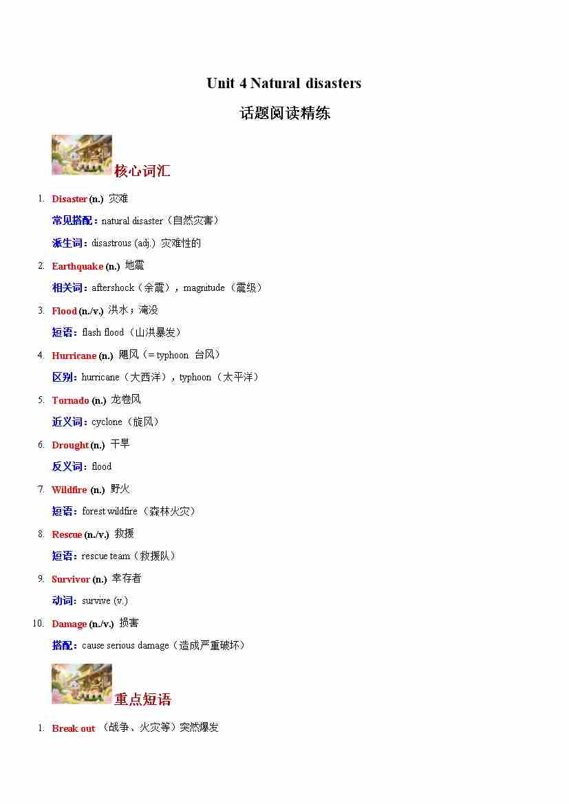 Unit 4 Natural disasters(话题阅读精练)英语人教版 2019必修第一册 (教师版)