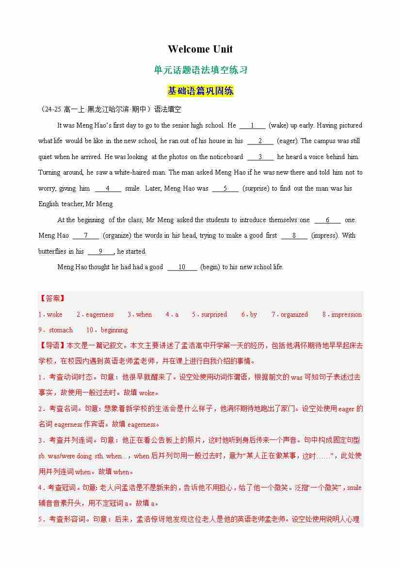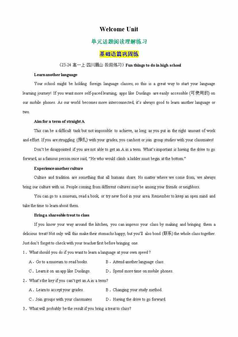 Welcome Unit 单元话题阅读理解练习(学生版)
