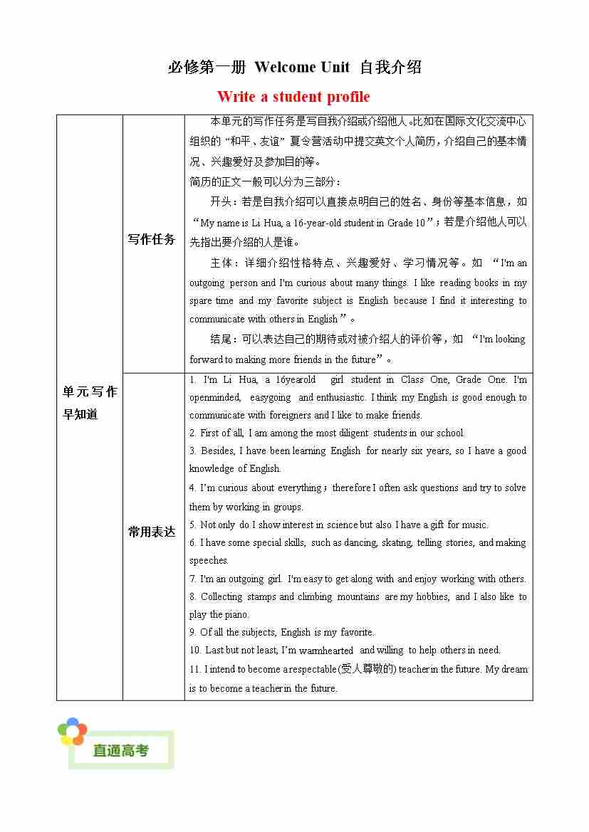 Welcome Unit 自我介绍(单元同步写作讲义)(教师版)