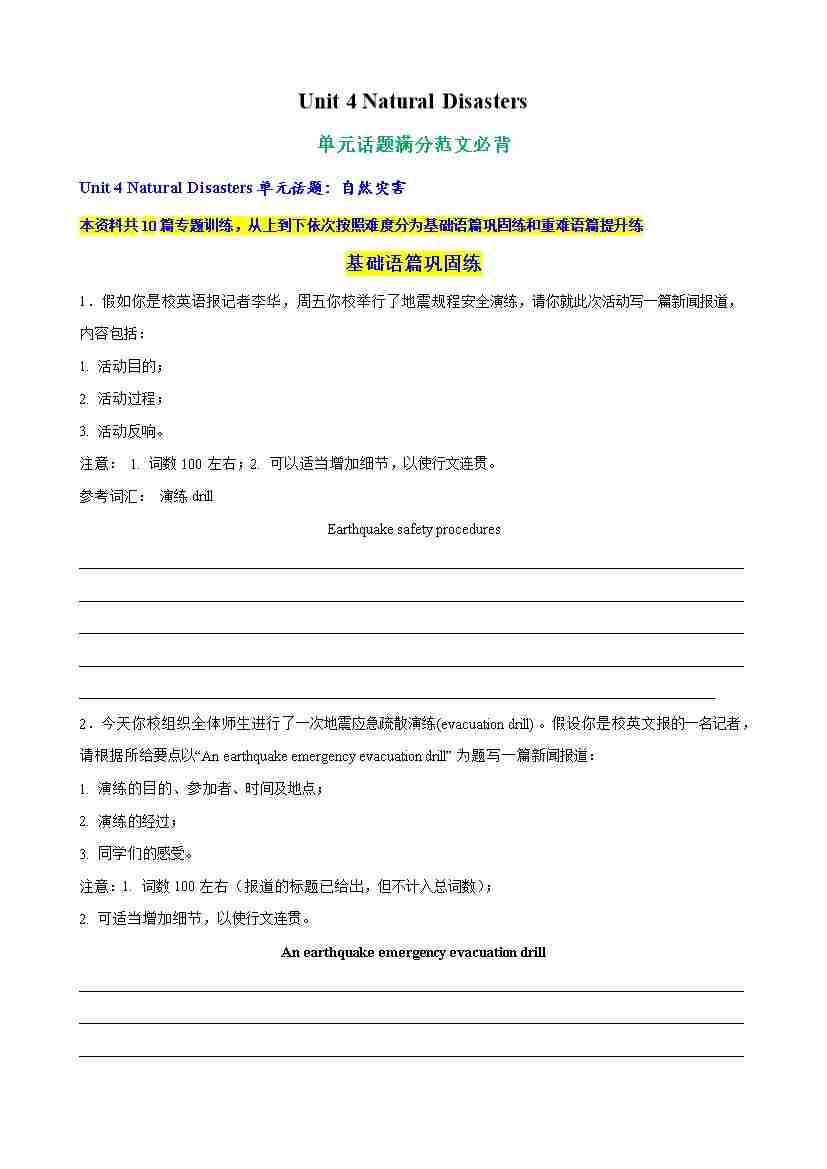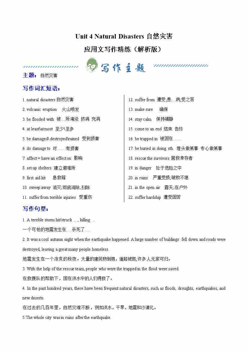 Unit 4 Natural Disasters 自然灾害(单元应用文写作精练)(教师版)