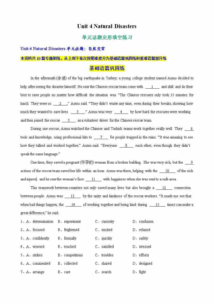 Unit 4 Natural Disasters单元话题完形填空练习(学生版)