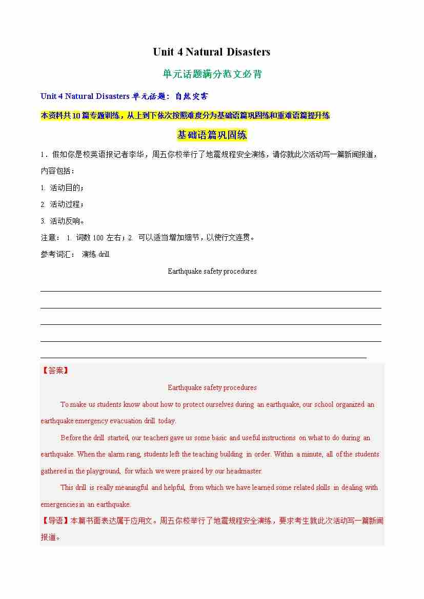 Unit 4 Natural Disasters单元话题满分范文必背(教师版)