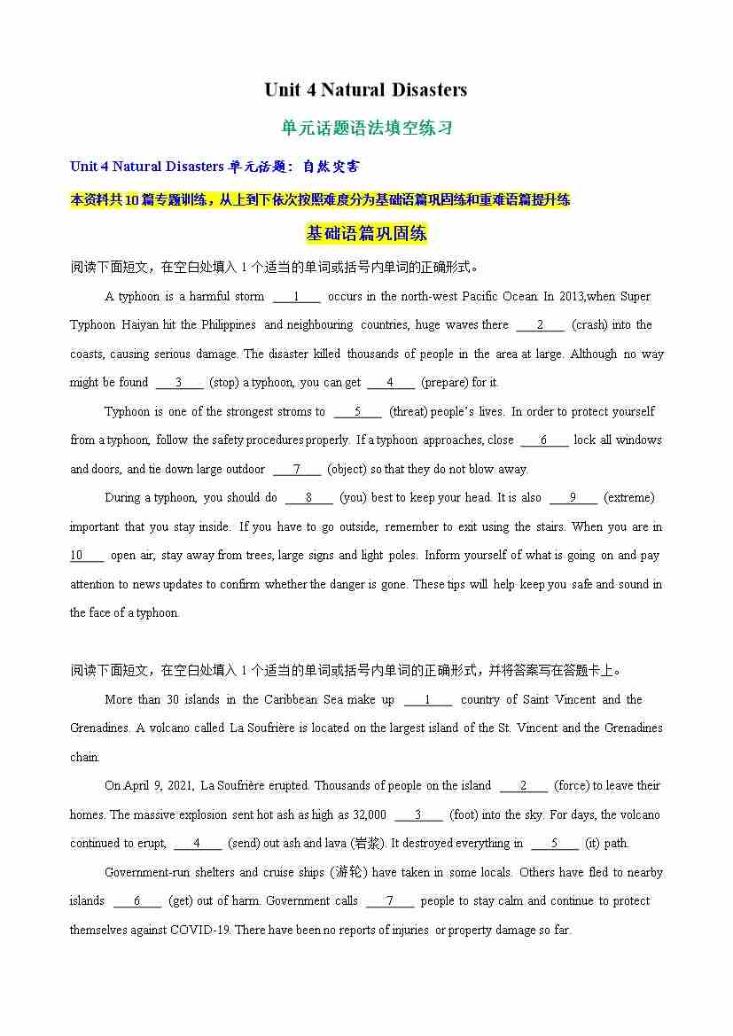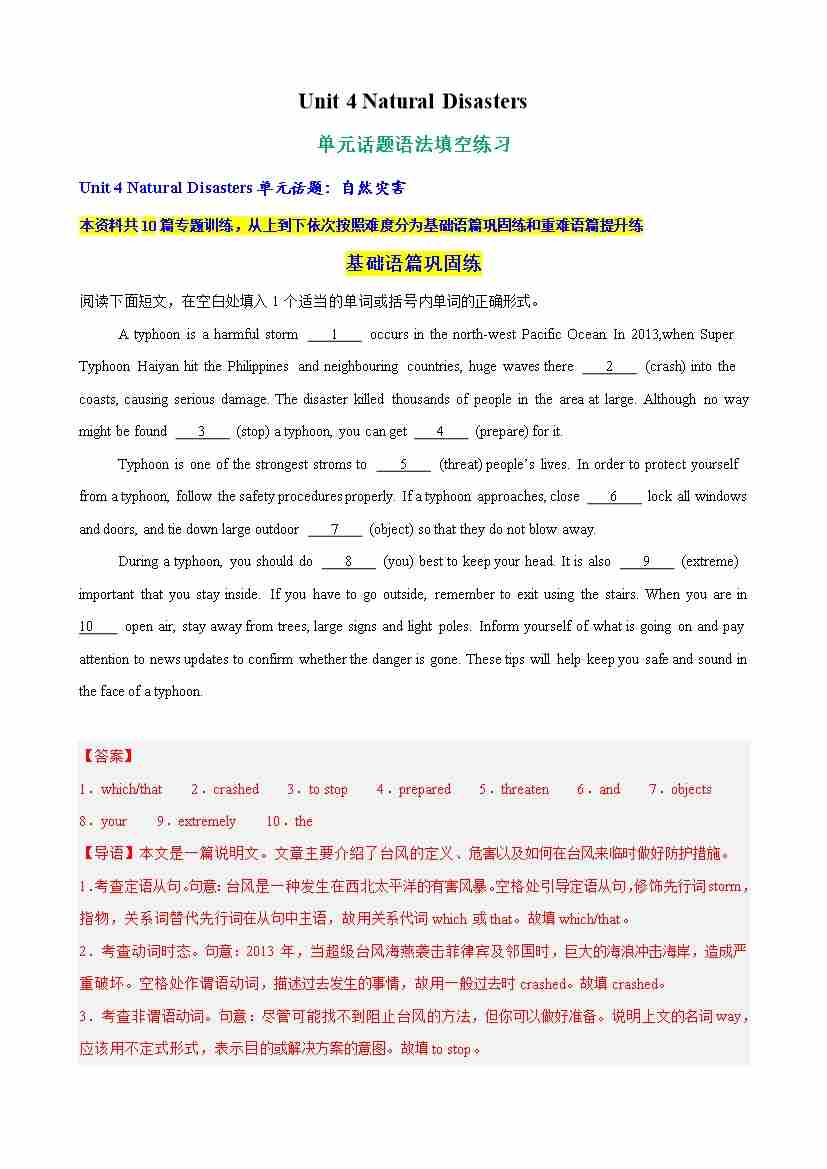 Unit 4 Natural Disasters单元话题语法填空练习(教师版)