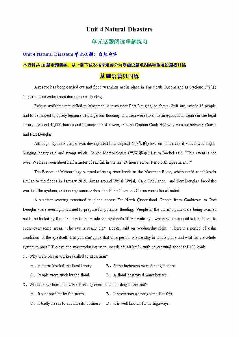 Unit 4 Natural Disasters单元话题阅读理解练习(学生版)
