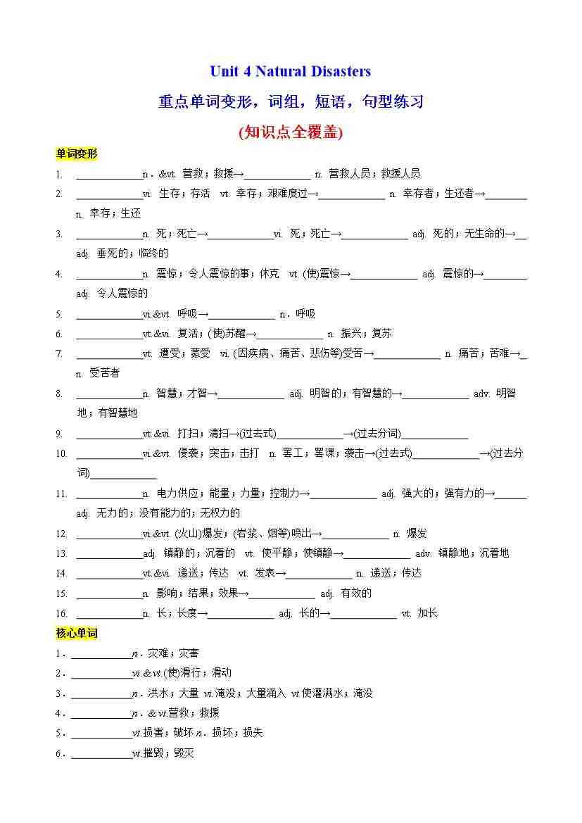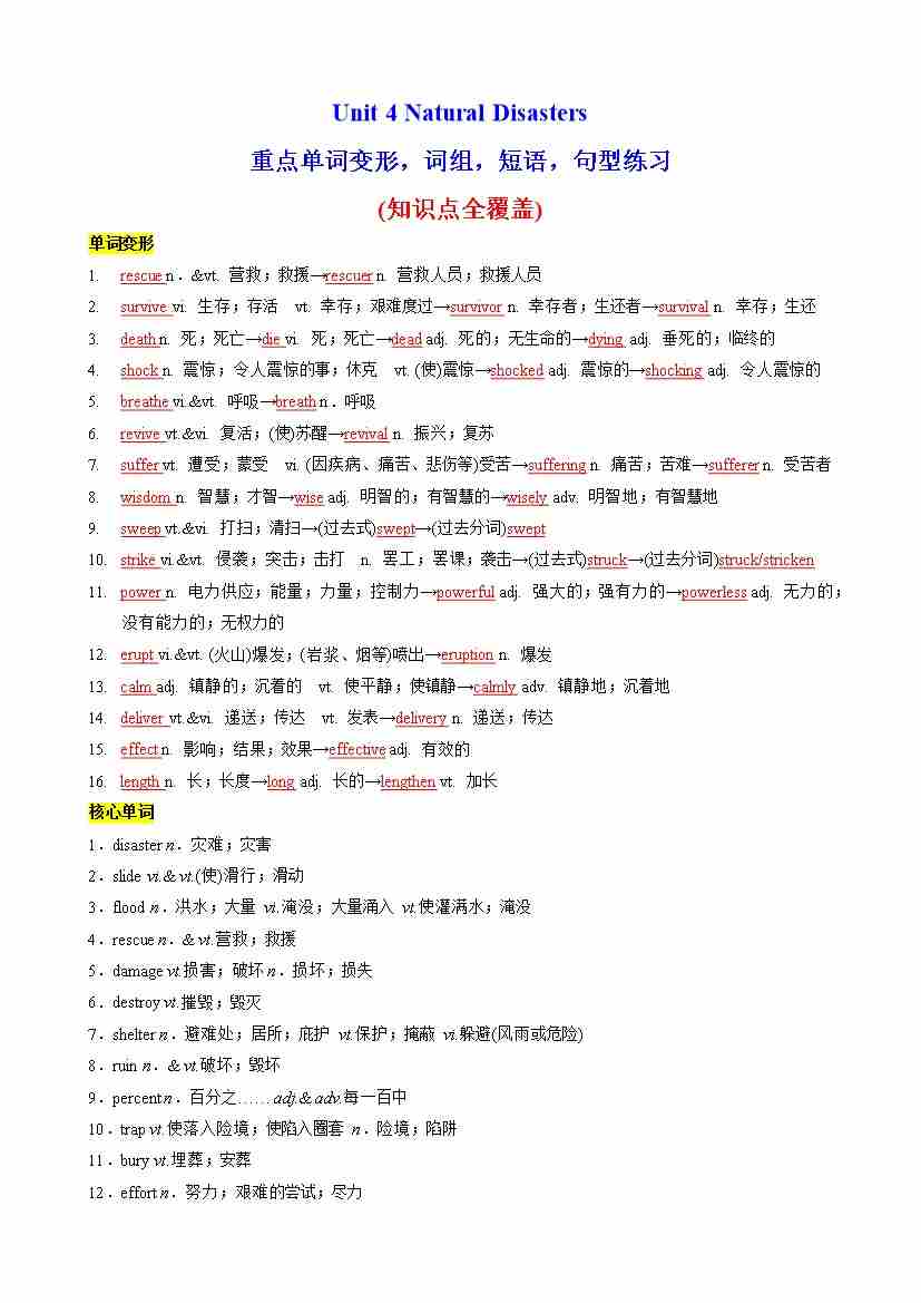 Unit 4 Natural Disasters词性转换,核心单词,语法,句型练习(教师版)